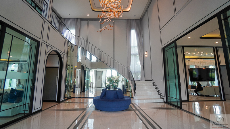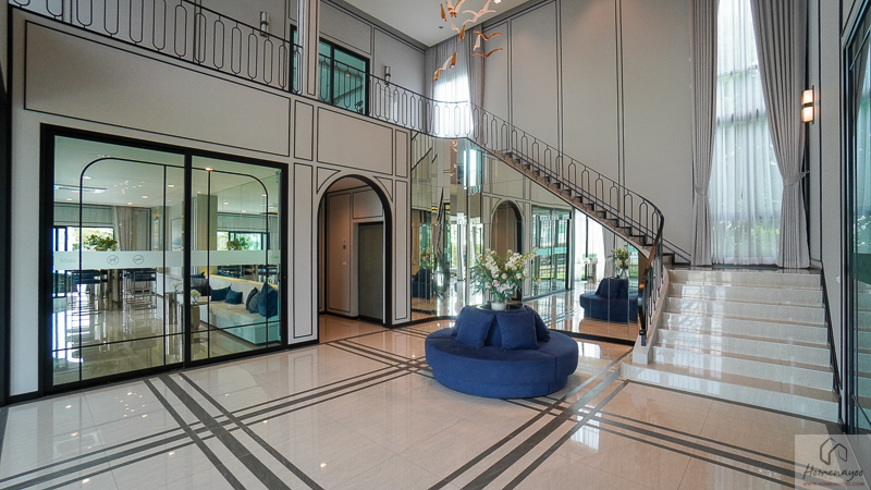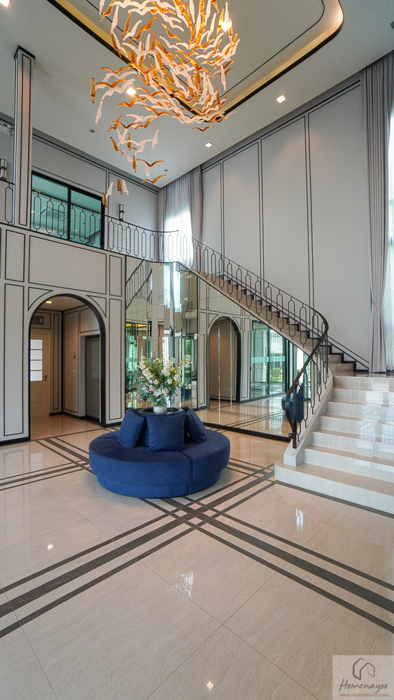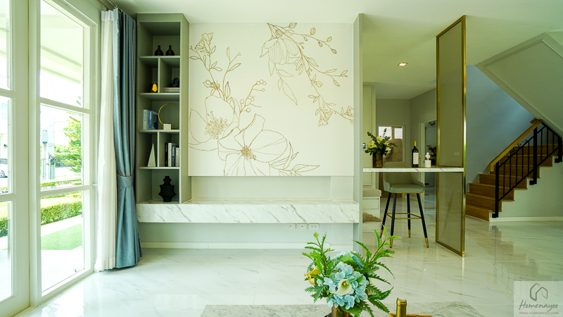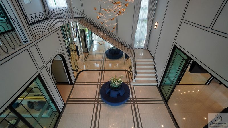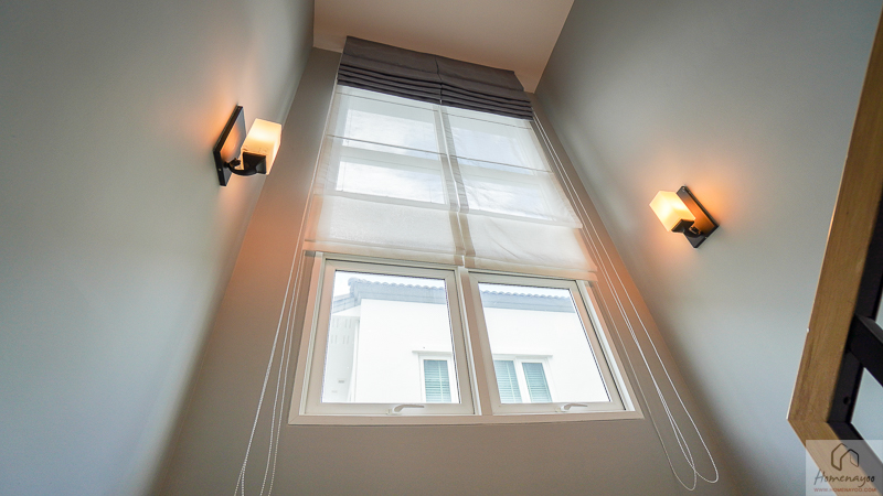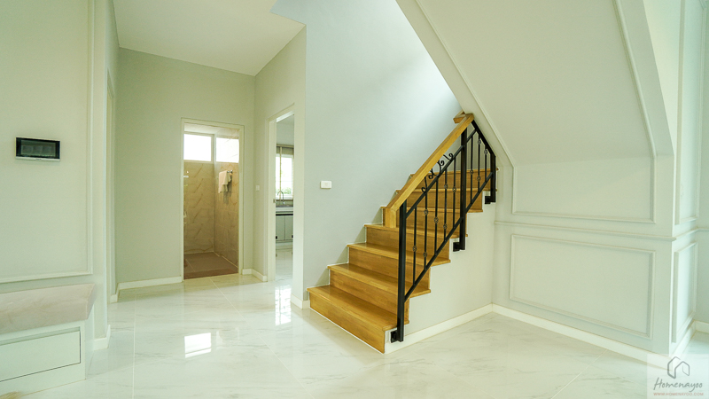 โถงบันไดออกแบบให้สูงโปร่ง รับแสงธรรมชาติจากหน้าต่างกระจกบานผสมทรงสูง ช่วยทั้งเพิ่มความสว่างและเปิดระบายอากาศได้ และบริเวณนี้จะมีไฟกิ่งดีไซน์คลาสสิกติดมาให้อีก 1 คู่