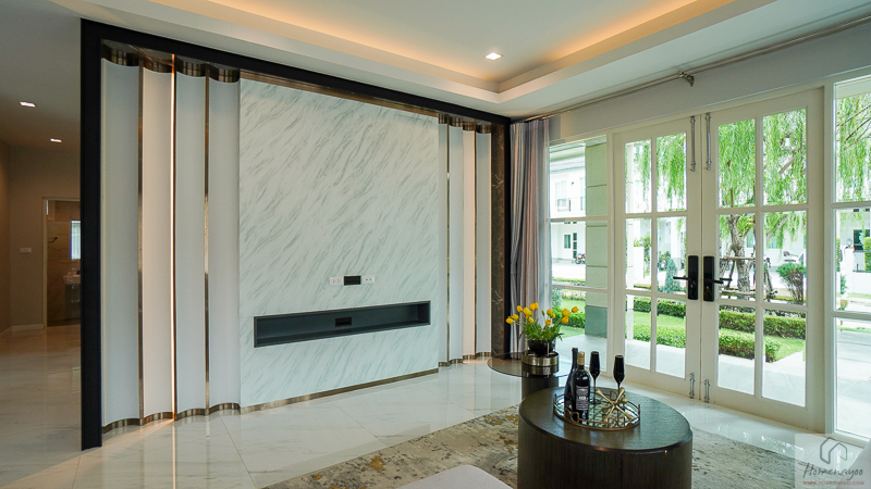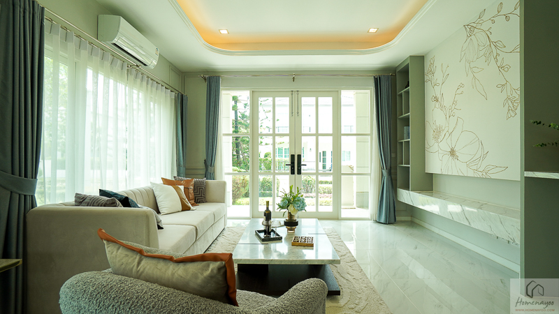 มองกลับมาด้านหน้าบ้าน ตรงกลางจะมีพื้นที่เหลือกว้างมาก ๆ สามารถดูทีวีจอใหญ่ได้สบายตา และมีพื้นที่เหลือให้เดินเข้า-ออกบ้านได้สะดวก ไม่ติดขัดกับส่วนอื่น ๆ