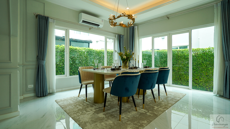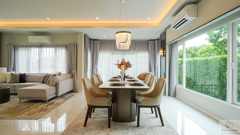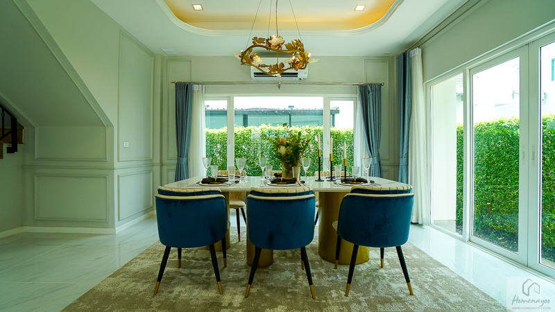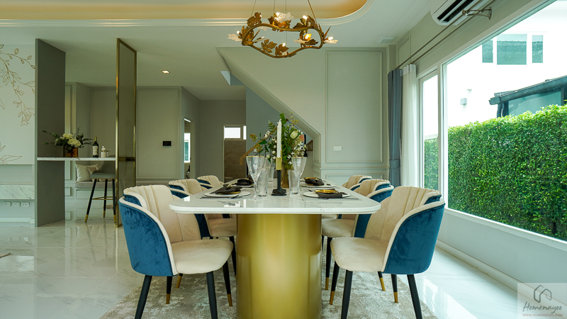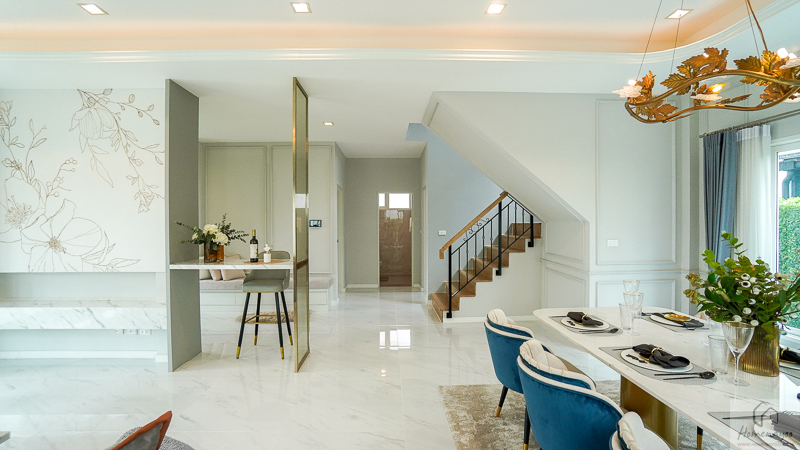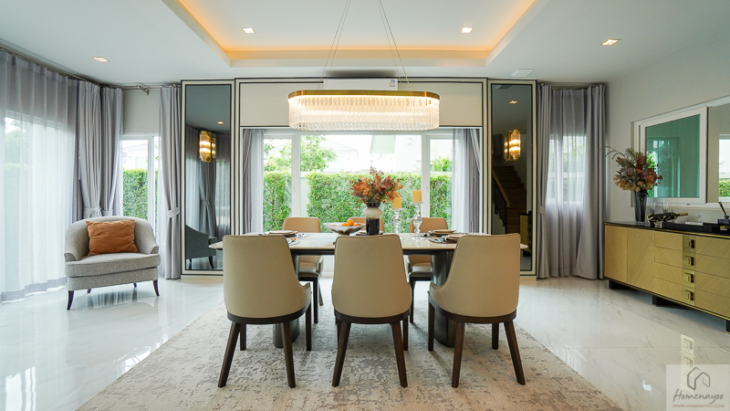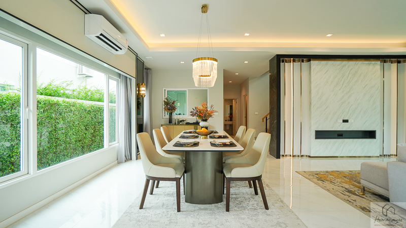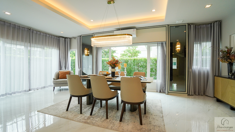 มุมทานอาหาร ออกแบบให้กว้างและโปร่งสบาย สามารถวางโต๊ะอาหารขนาด 6-10 ที่นั่ง ได้อย่างลงตัว รองรับทั้งการทานข้าวในครอบครัว และการจัดปาร์ตี้สังสรรค์กับเพื่อน ๆ ได้สบาย