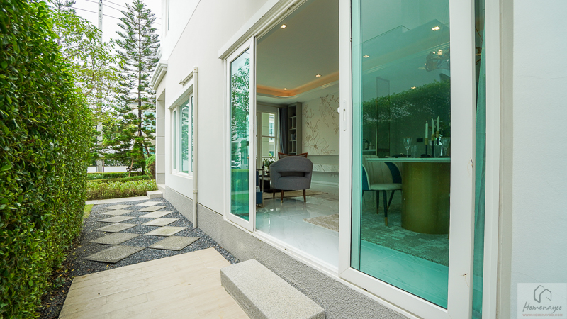 ด้านข้างบ้านที่เชื่อมกับมุมทานอาหาร มีการขยายพื้นที่ พร้อมติดช่องแสงทั้ง 3 ด้าน ตรงกลางเป็นประตูกระจกบานเลื่อน เปิดเชื่อมต่อออกสู่สวนข้างบ้านได้โดยตรง
