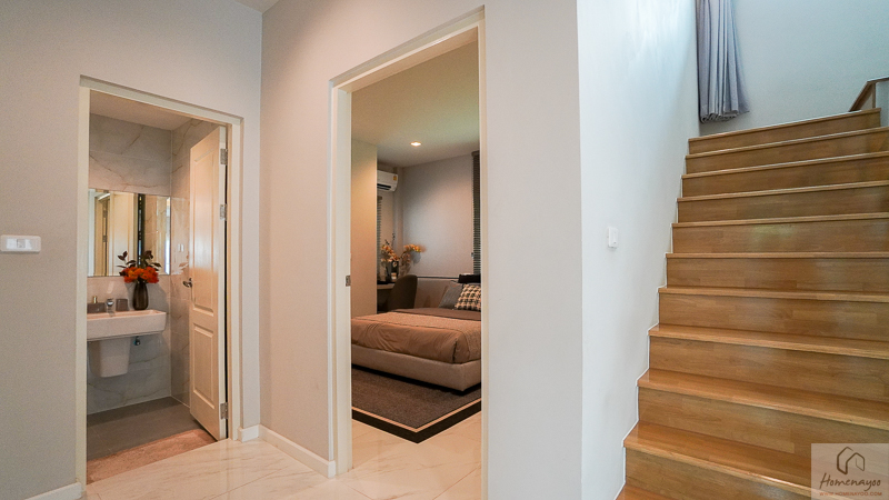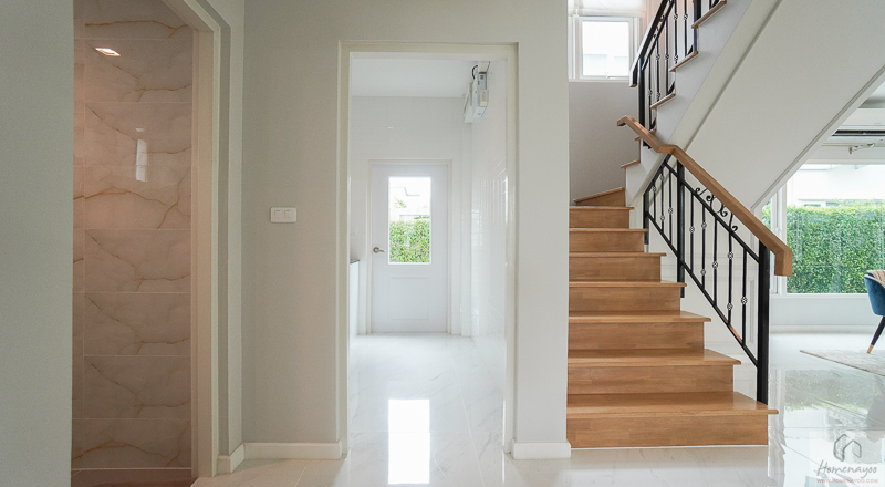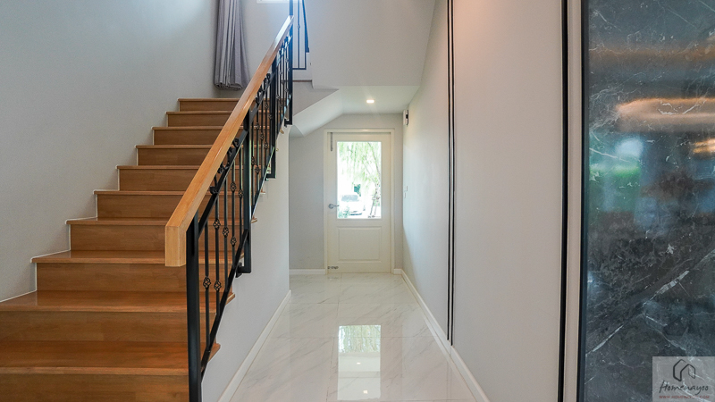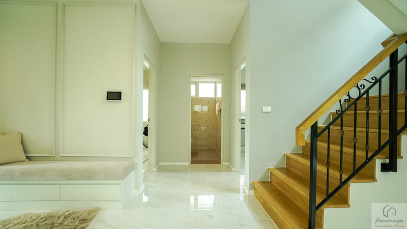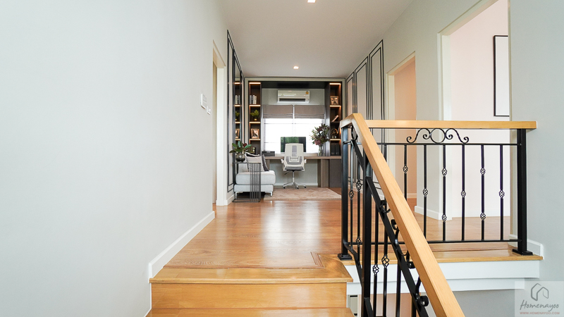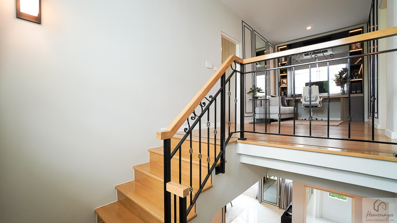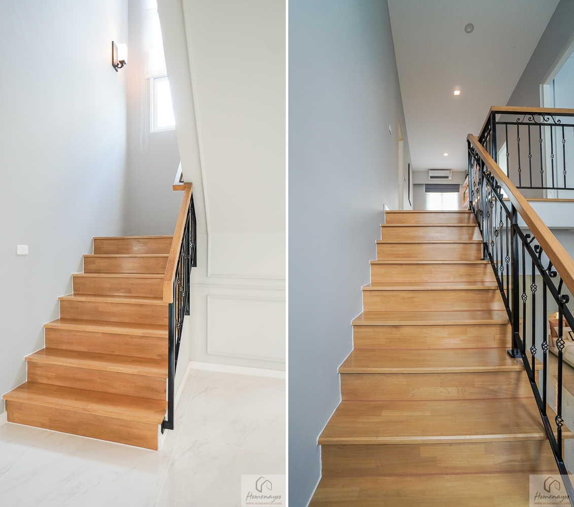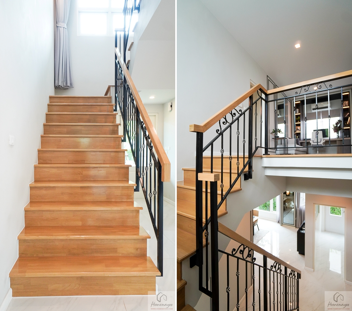 บันไดบ้านเป็นรูปตัว U โครงสร้างคอนกรีตเสริมเหล็ก แข็งแรงทนทาน ปิดผิวลูกนอนด้วยไม้ประสานสีอ่อน เดินขึ้น-ลงได้มั่นคงและไร้เสียงรบกวน ติดตั้งราวระแนงเหล็กดัดสีดำจับคู่กับมือจับไม้สีเดียวกับลูกนอนต่อเนื่องถึงชั้น 2