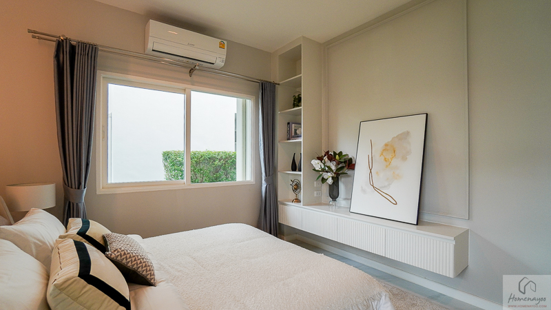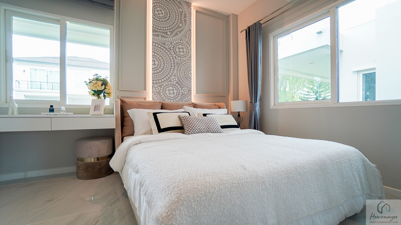 ในบ้านตัวอย่างจัดฟังก์ชันเป็นห้องนอน โดยเลือกวางเตียง Queen Size และโต๊ะหัวเตียงด้านข้างมาให้ดูระยะใช้งาน
