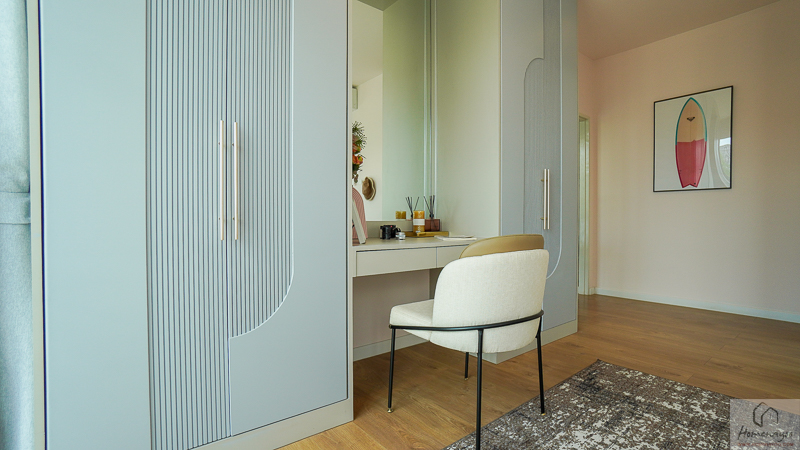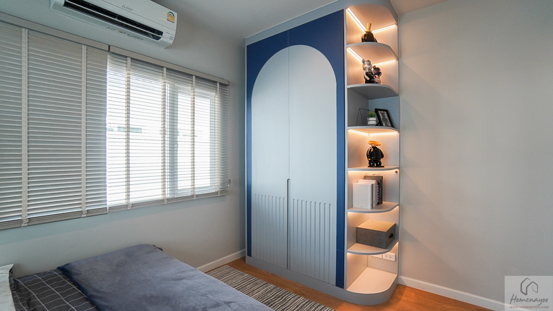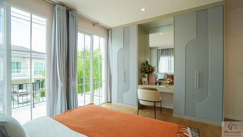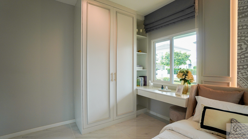 ข้างเตียงนอนมีพื้นที่ให้วางตู้เสื้อผ้าขนาดมาตรฐาน ข้าง ๆ กันมีพื้นที่ว่างให้วางโต๊ะเครื่องแป้งแบบ 1 ที่นั่ง เพิ่มเข้าไปได้
