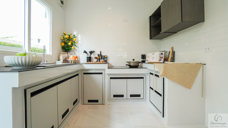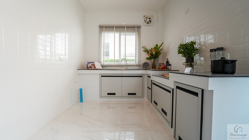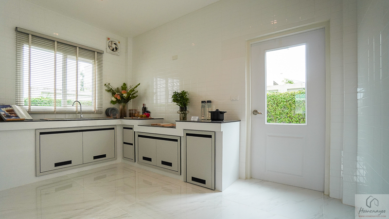 ห้องครัวภายในบ้านขนาดใหญ่ ปูพื้นแกรนิตโต้ 80 x 80 ซม. ต่อเนื่องมาจากด้านนอก ทางโครงการ Built-in เคาน์เตอร์ครัว U-Shape มาให้เรียบร้อย ไม่ต้องต่อเติมเพิ่มให้เสียเวลา และช่วย Save Cost ให้เจ้าของบ้านไปได้หลักแสน