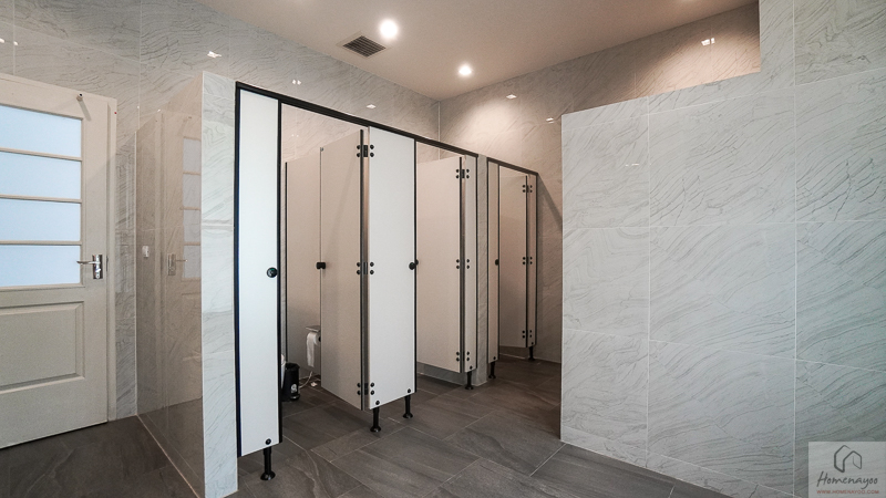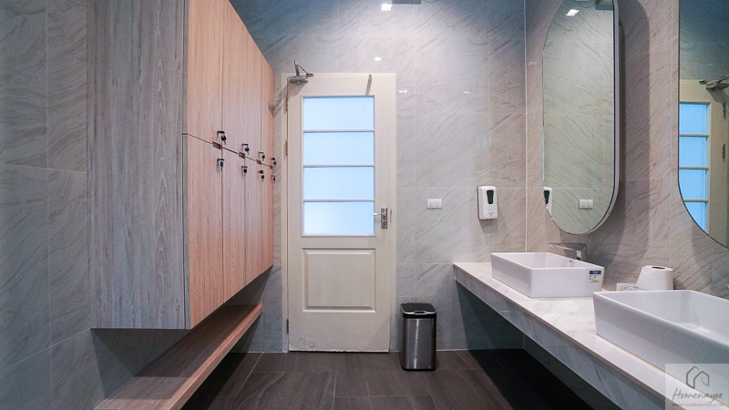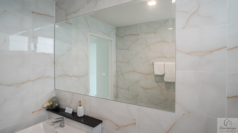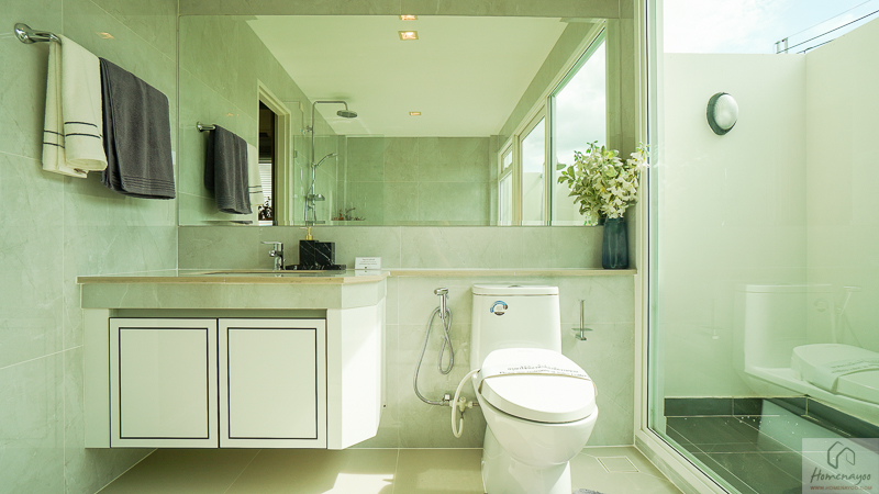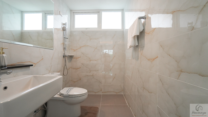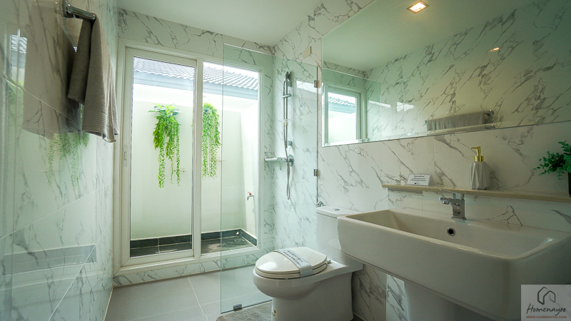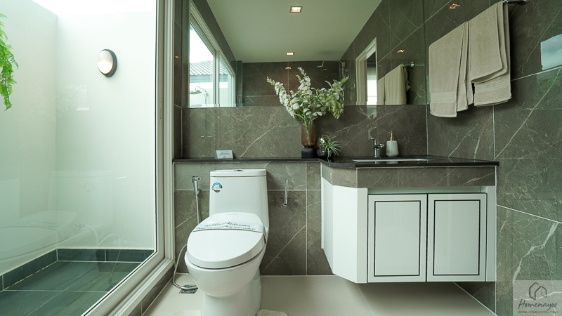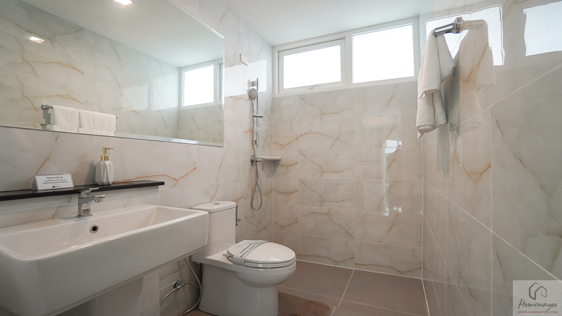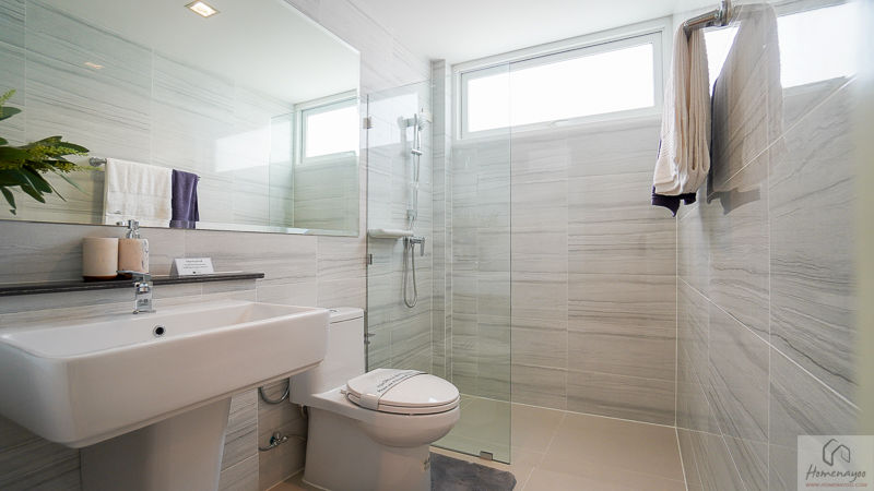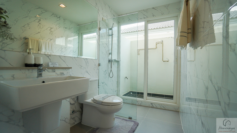ห้องน้ำขนาดใหญ่ ดีไซน์เป็นแบบตอนลึก มีการแบ่งส่วนแห้งและส่วนเปียกชัดเจน ภายในตกแต่งด้วยกระเบื้องลายหินอ่อน ผสมกับกระเบื้องพื้นสีเทาให้ความรู้สึกสะอาดตา สุขภัณฑ์ใช้เป็นของ American Standard ติดตั้งมาให้ครบพร้อมใช้งาน