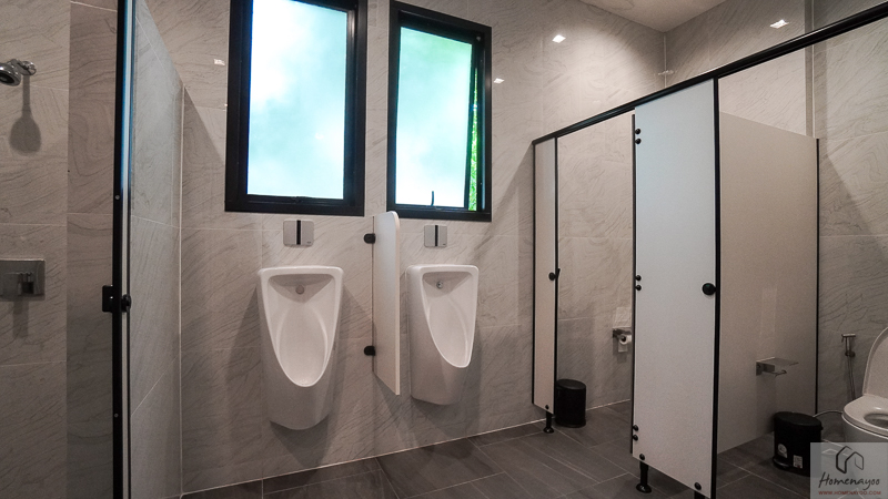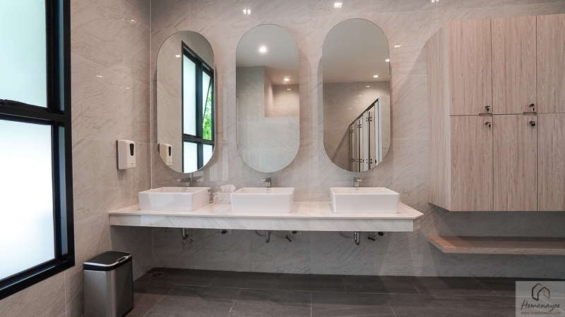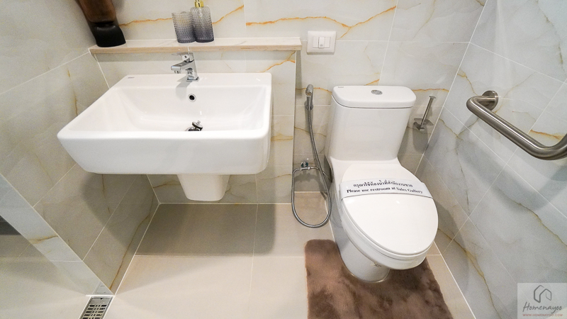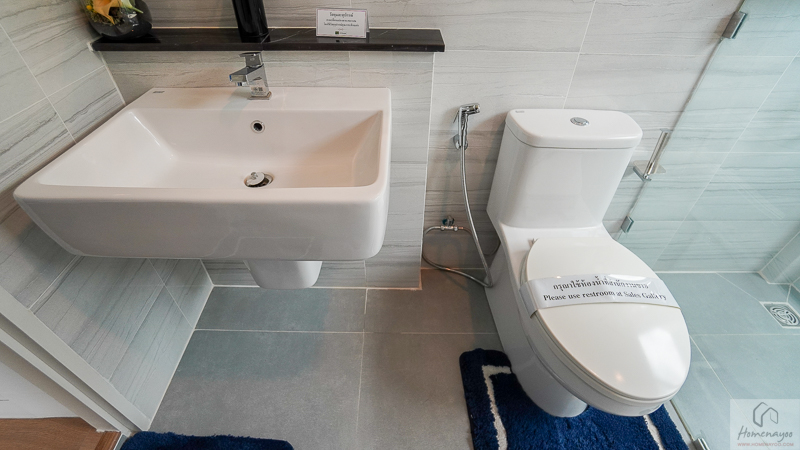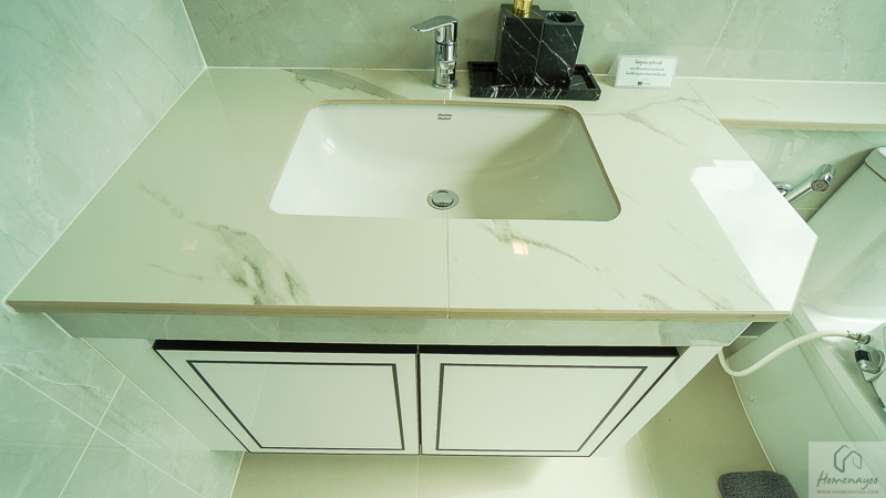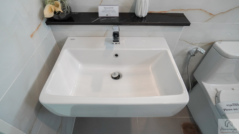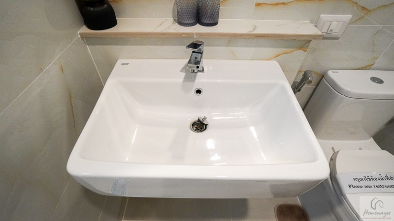 อ่างล้างมือเป็นทรงเหลี่ยมขนาดใหญ่แบบแขวนผนัง ก๊อกน้ำเป็นแบบก้านโยก และด้านหลังจะมี Low-Wall ไว้วางของใช้จุกจิกได้พอสมควร