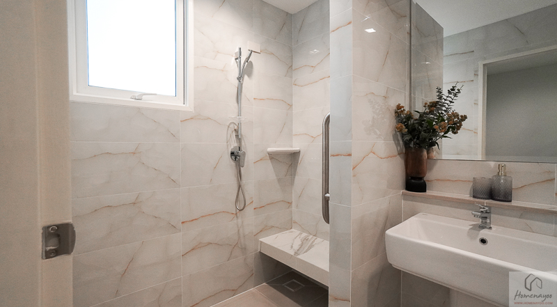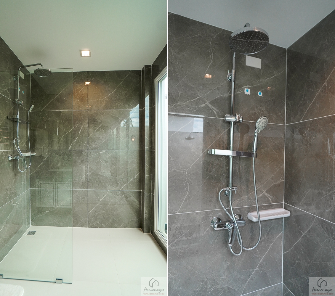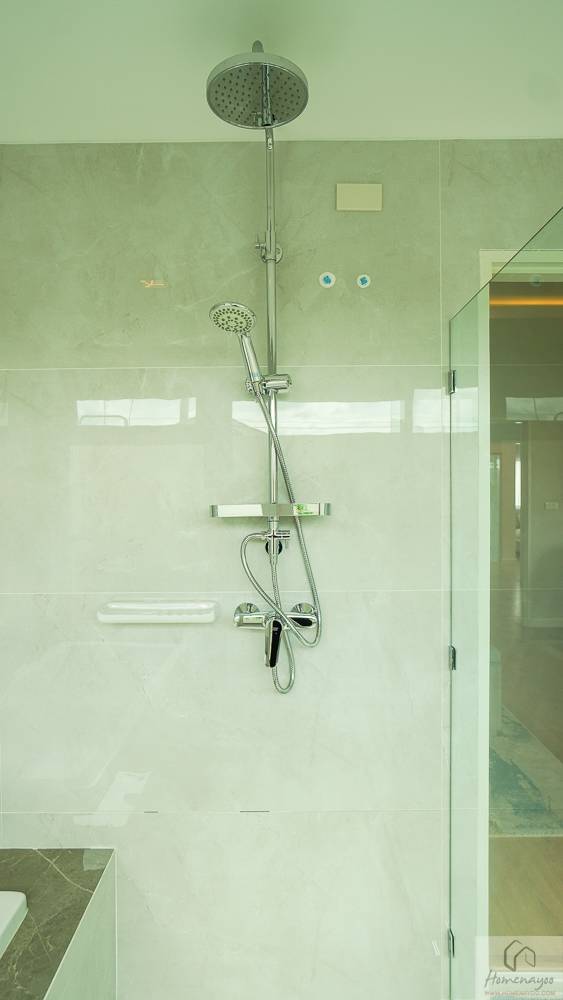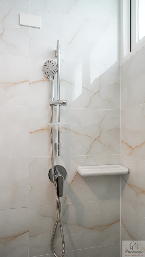 ห้องน้ำ Master จัดเต็มด้วยการติดตั้งฝักบัว 2 แบบ ทั้ง Hand Shower และ Rain Shower ให้เลือกใช้งานได้ตามต้องการ ผนังมีชั้นวางของมาให้ 1 จุด พร้อม Junction Box รองรับการติดตั้งเครื่องทำน้ำอุ่น และที่พิเศษคือมีการเดินงานระบบน้ำร้อน-น้ำเย็นมาให้เรียบร้อยแล้วค่ะ