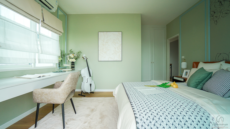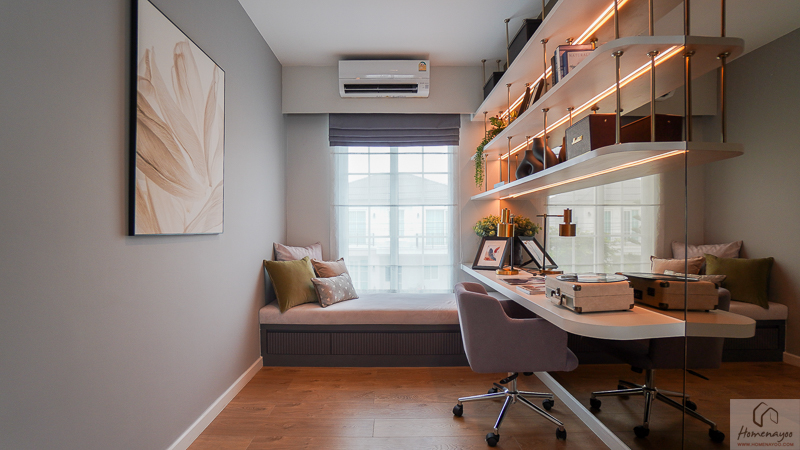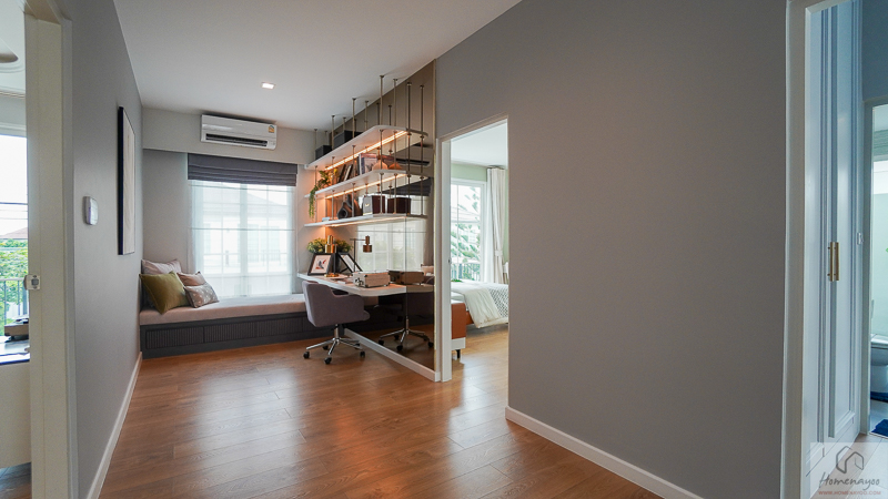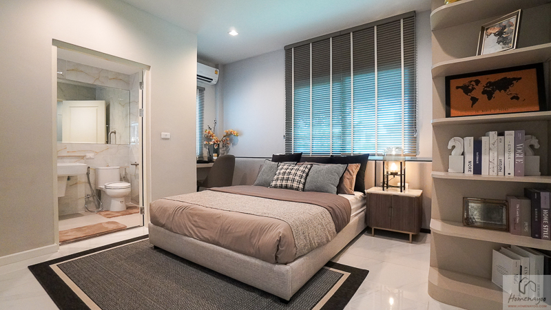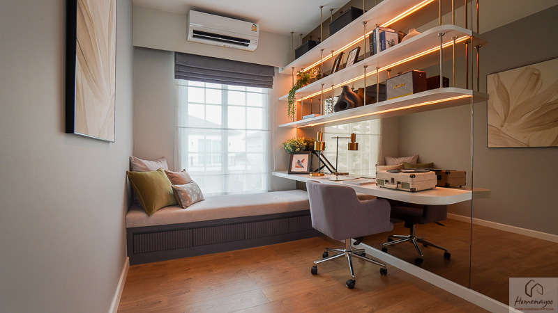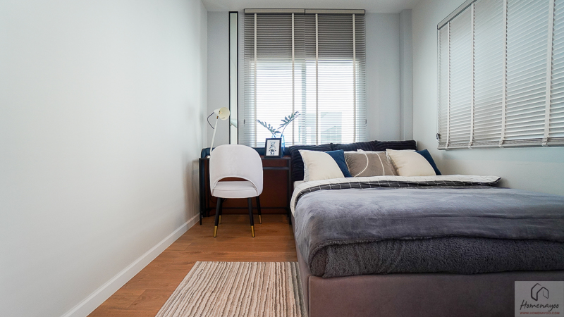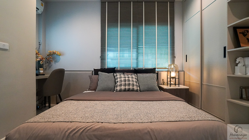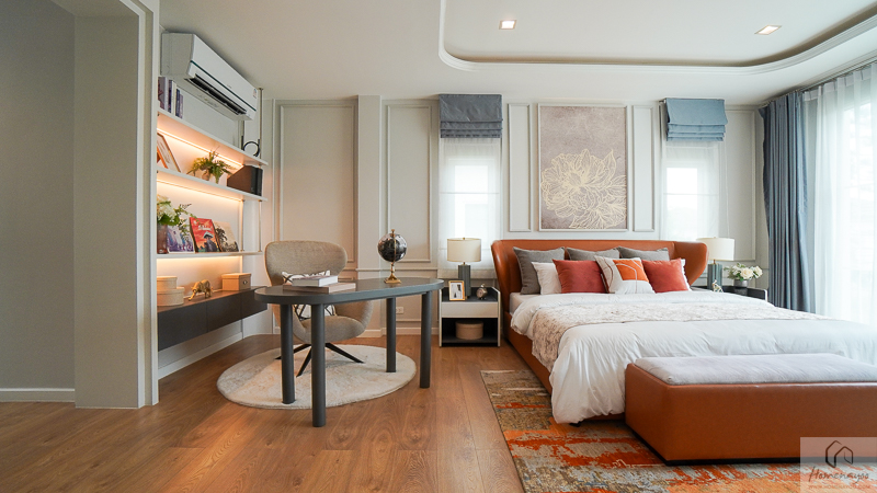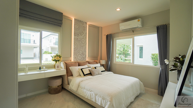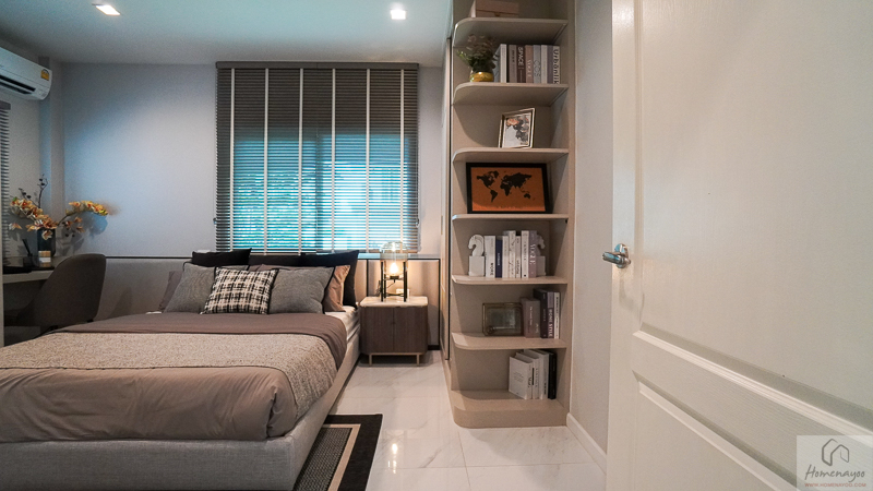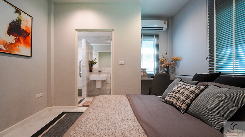 บ้านตัวอย่างวางเตียง Queen Size และโต๊ะทำงานแบบ 1 ที่นั่ง ้ขางเตียงนอนมาให้ดูระยะการใช้งาน