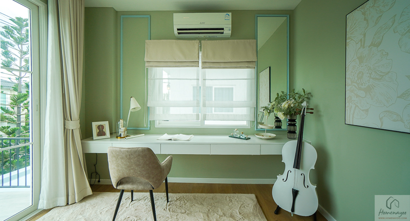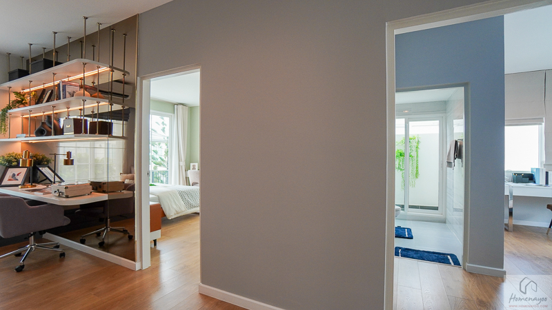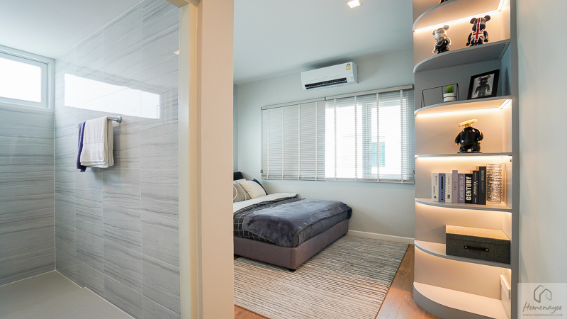 อีกด้านของห้องจะมี Corner เข้ามุมให้ทำเป็นมุมทำงานชมวิวสวนข้างบ้าน ติดกันเป็นห้องน้ำส่วนตัวในห้องนอน