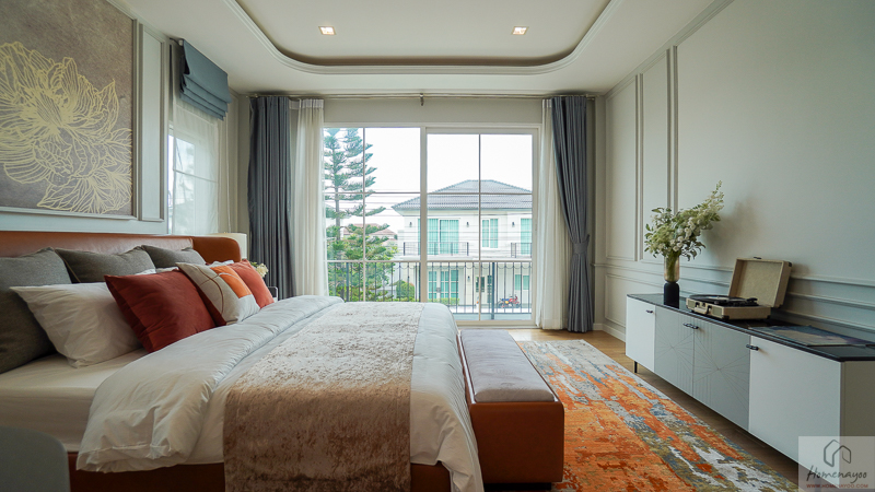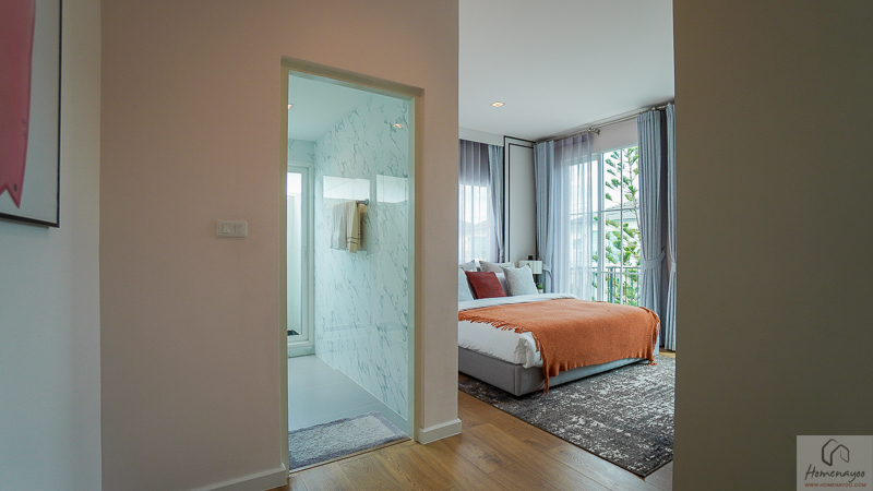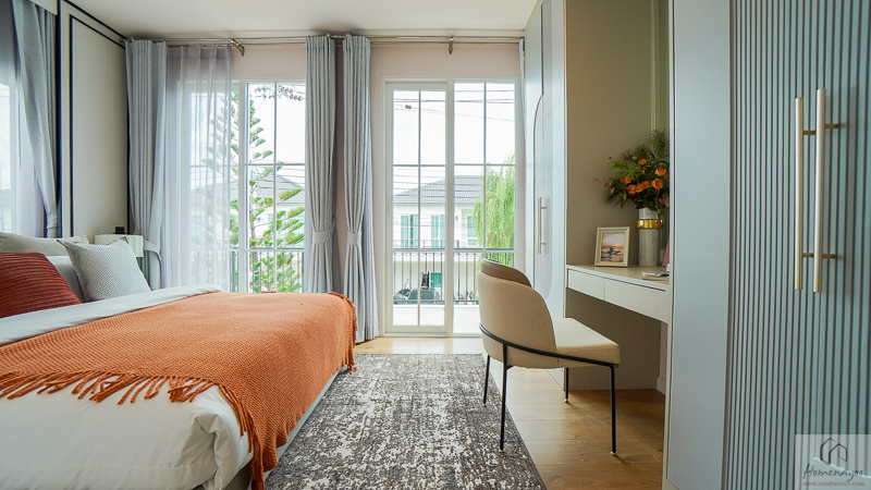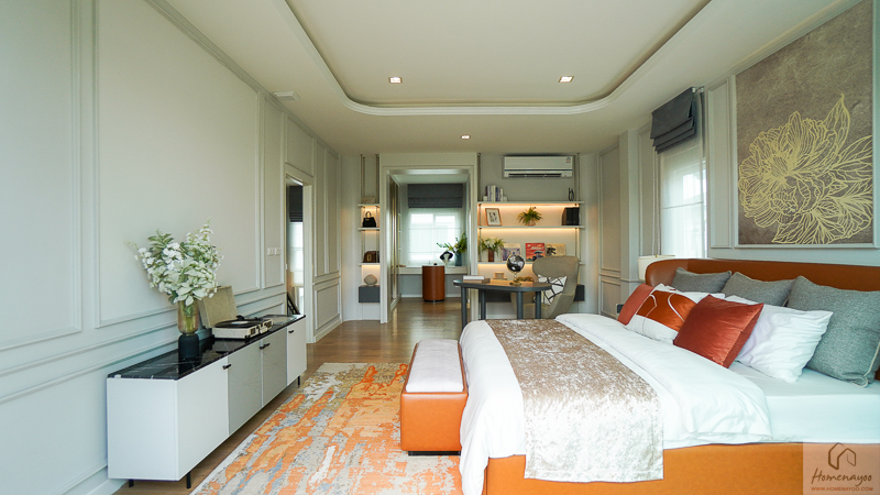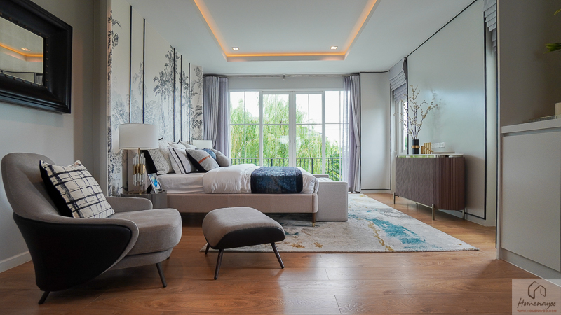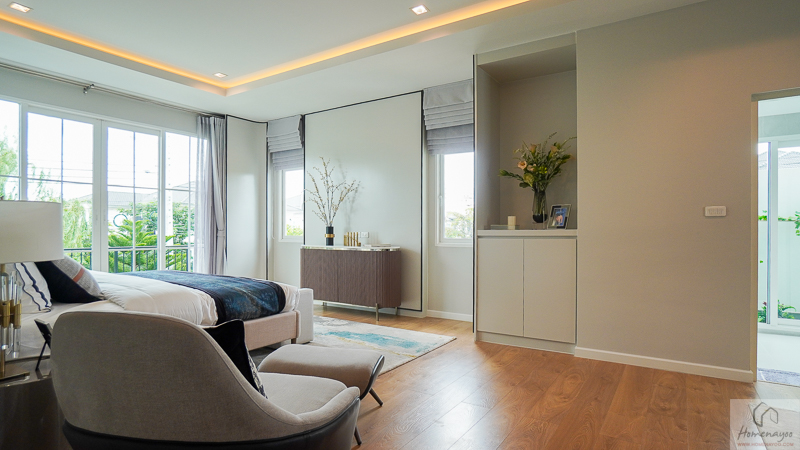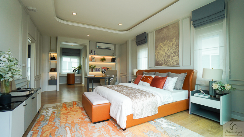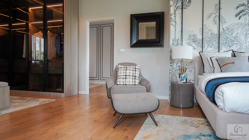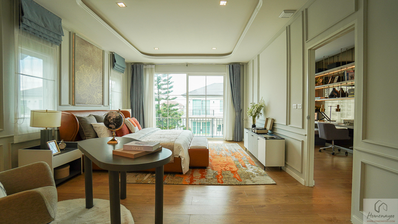 Master Bedroom 1 ทางฝั่งหน้าบ้านเป็นห้องที่มีขนาดใหญ่ที่สุดของบ้าน ออกแบบให้ภายในกว้างขวางและเป็นสัดส่วน รองรับการจัดฟังก์ชันได้ครบ ทั้งโซนนั่งเล่นพักผ่อน, โซนวางเตียงนอน และ Walk-in Closet