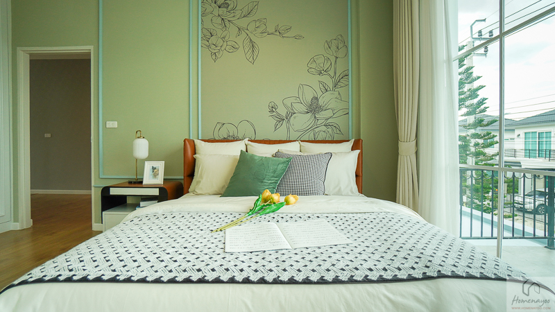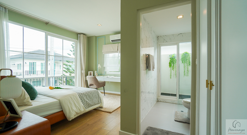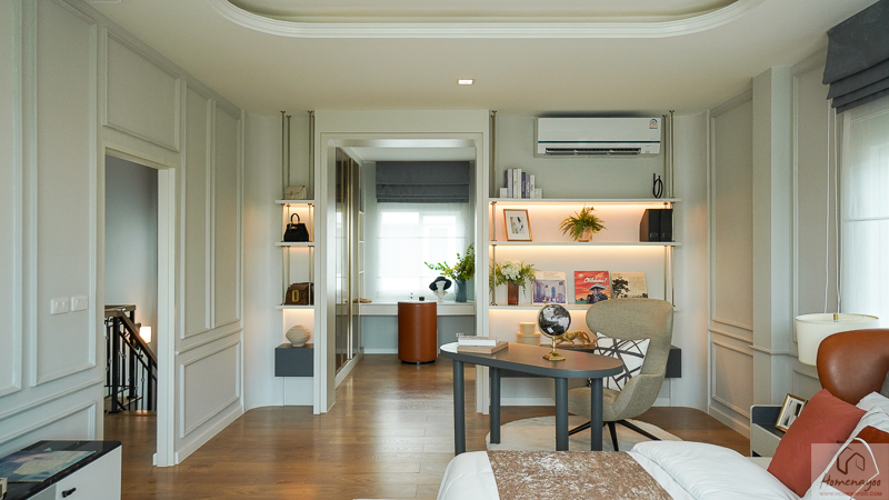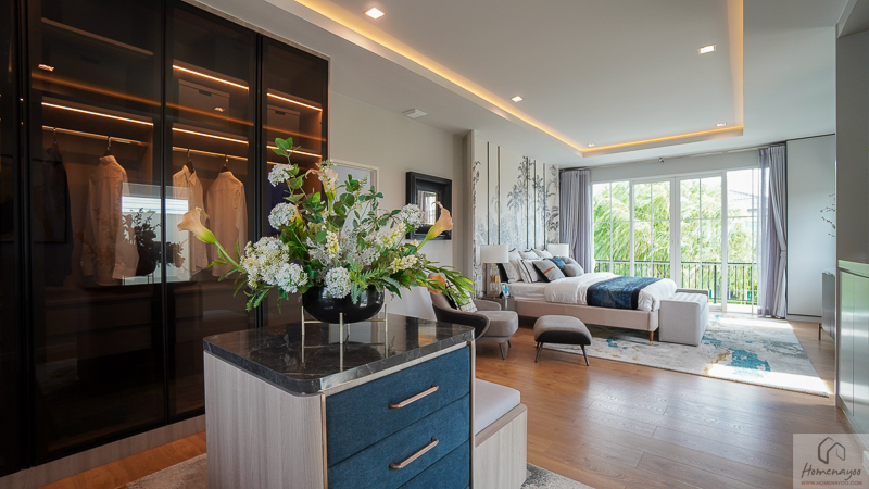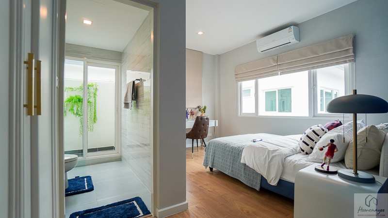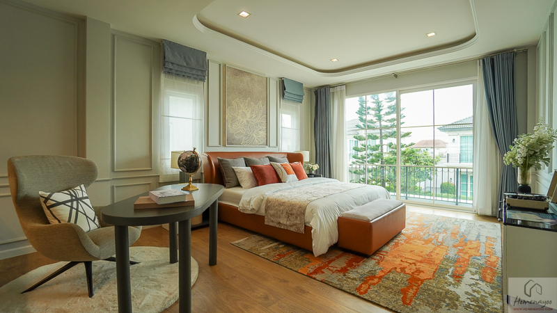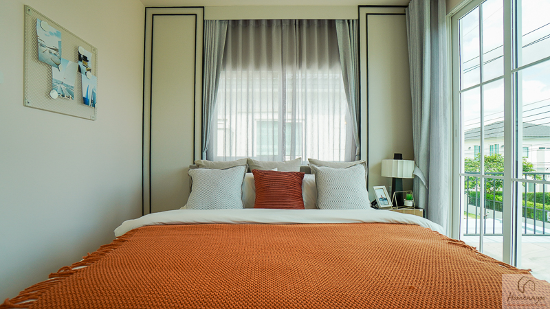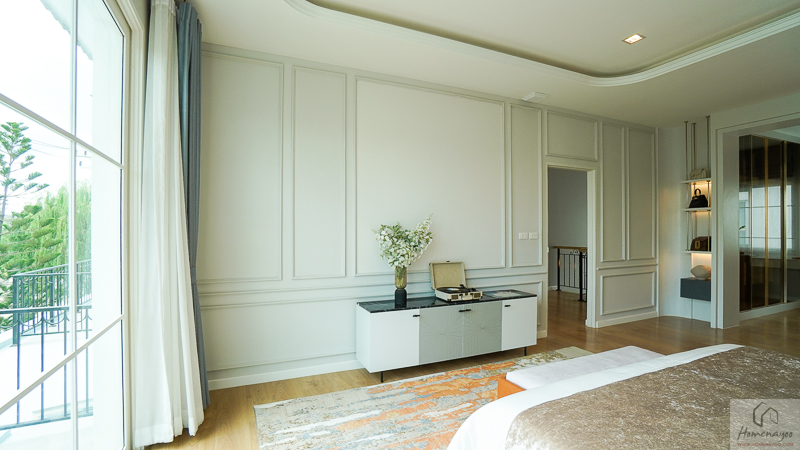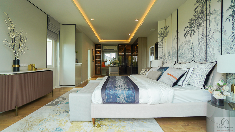 Master Bedroom 1 ทางฝั่งหน้าบ้านเป็นห้องที่มีขนาดใหญ่ที่สุดของบ้าน ออกแบบให้ภายในกว้างขวางและเป็นสัดส่วน รองรับการจัดฟังก์ชันได้ครบ ทั้งโซนนั่งเล่นพักผ่อน, โซนวางเตียงนอน และ Walk-in Closet
