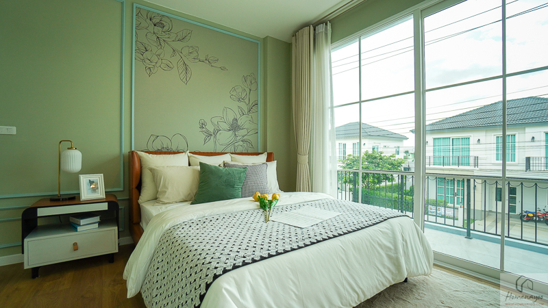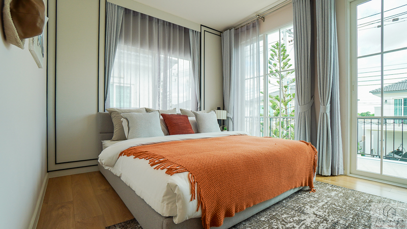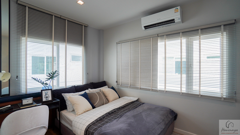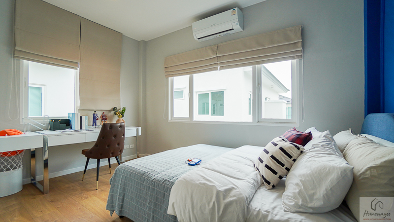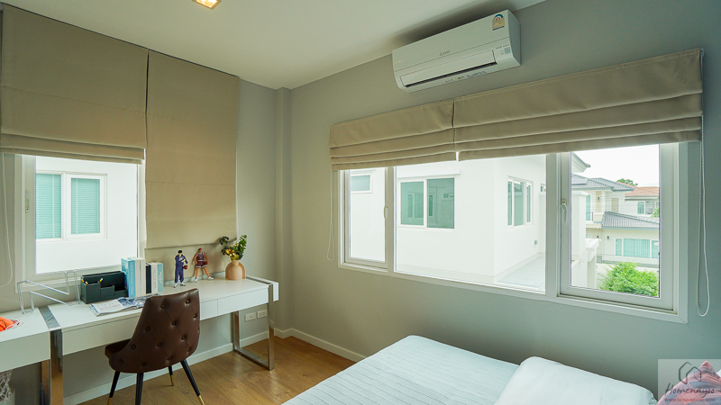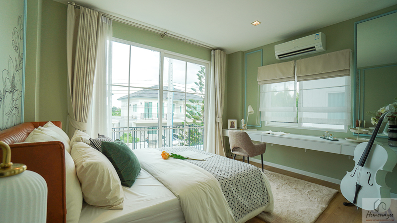 ห้องนอน 4 ได้บรรยากาศโปร่งสบาย เพราะมีหน้าต่างกระจกติดมา 2 จุด ทั้งด้านหน้าบ้านและด้านข้างบ้าน ทำให้ห้องรับแสงธรรมชาติและระบายอากาศได้ดี