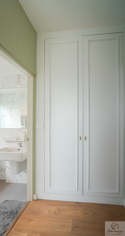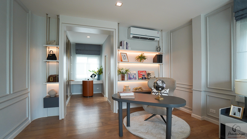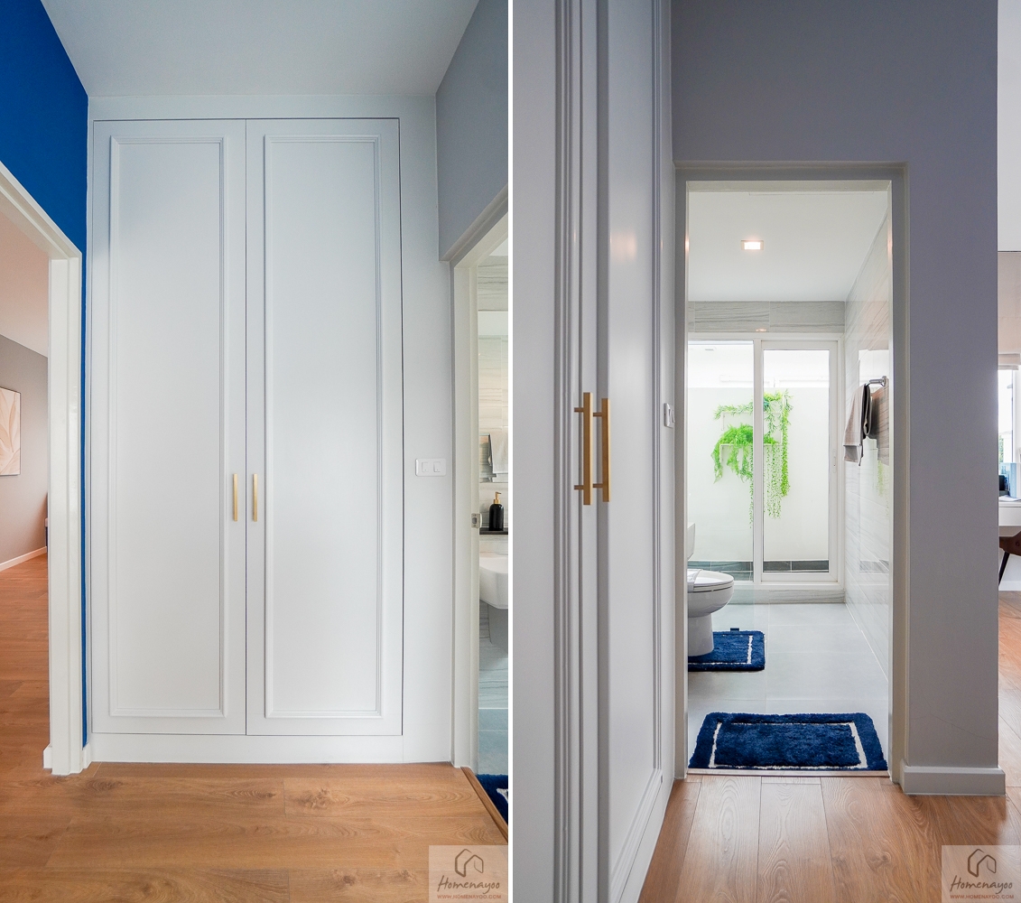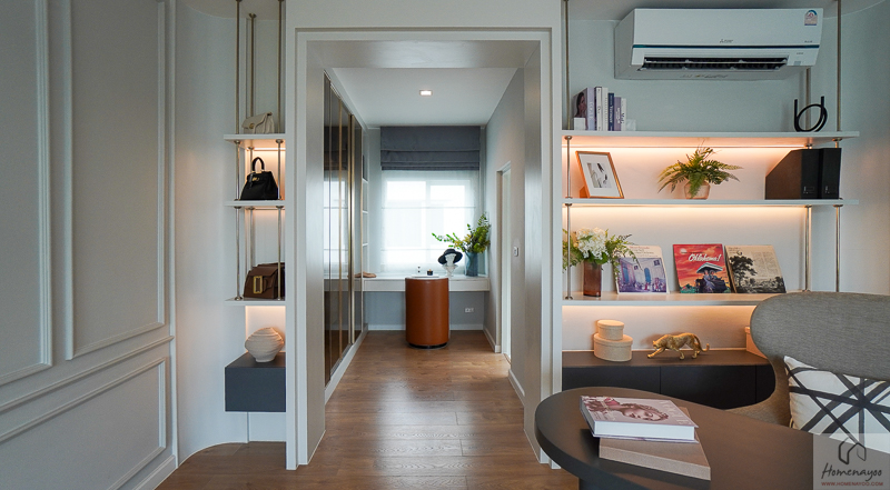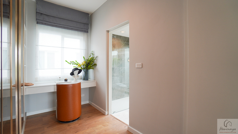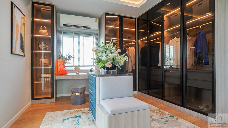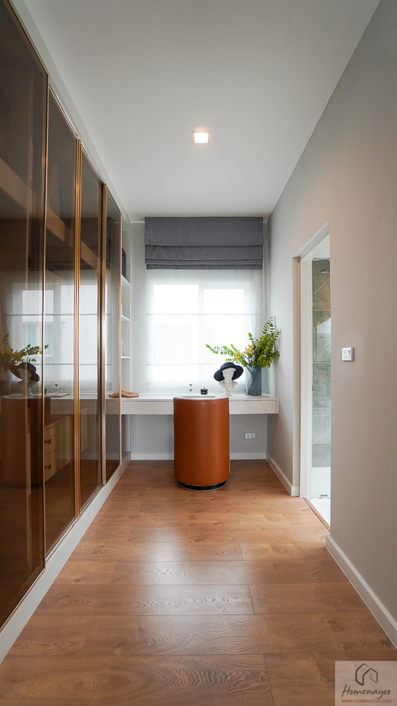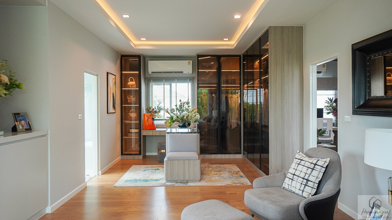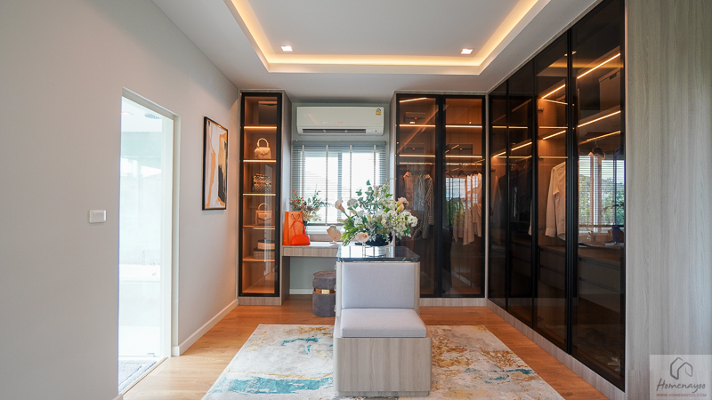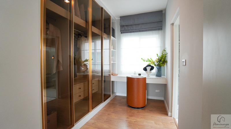 ภายในจะตกแต่งเป็น Walk-in Closet ขนาดใหญ่ โดย Built-in ตู้เสื้อผ้าเต็มพื้นที่ได้เลย หรือใครจะแบ่งโซน His & Her ก็ทำได้ลงตัว ตรงกลางเหลือพื้นที่สำหรับทำโต๊ะเครื่องแป้ง 1 ที่นั่งแบบหลวม ๆ และมีพื้นที่ให้วาง Island สำหรับเก็บ Accessories ได้