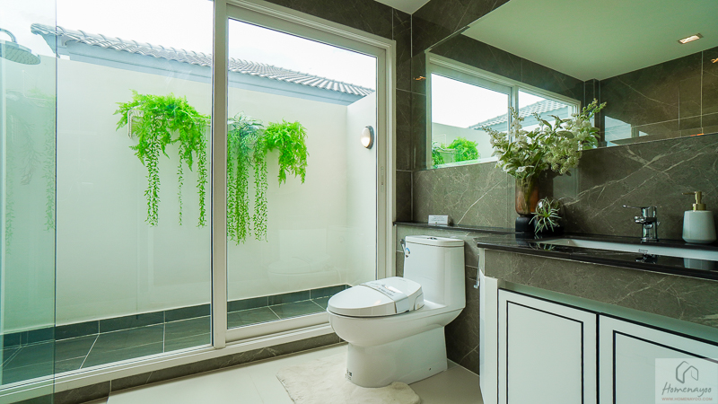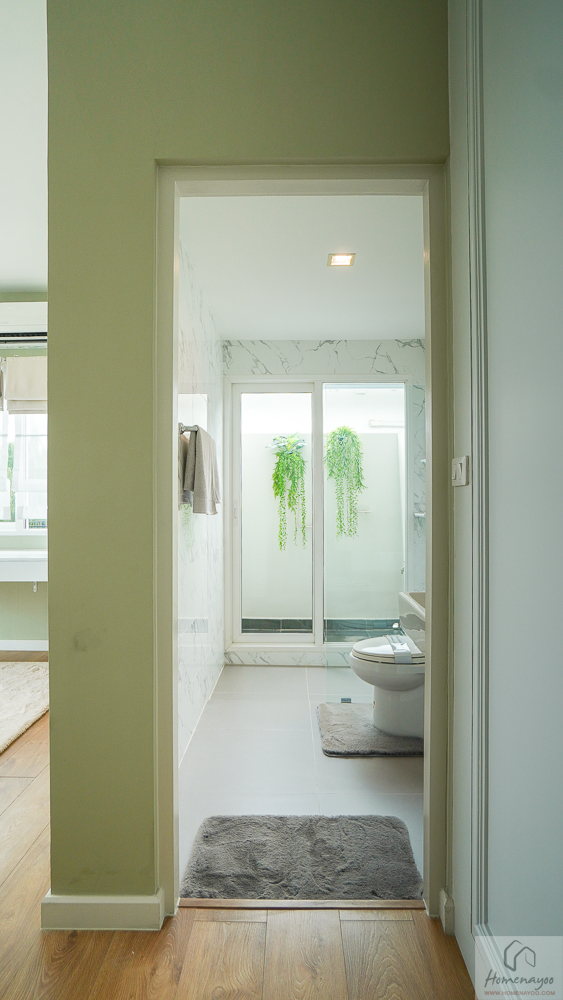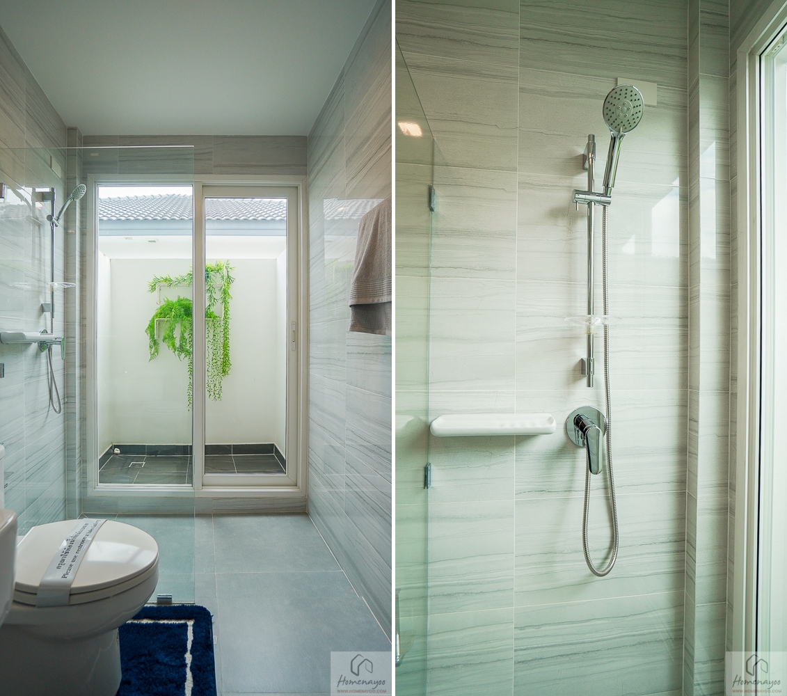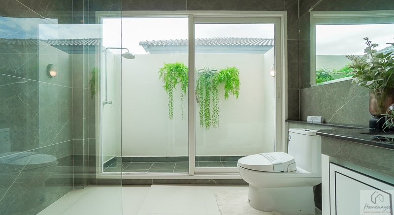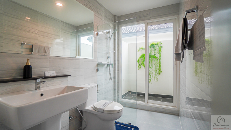 จุดเด่นคือมี ประตูกระจกบานใหญ่ เชื่อมต่อออกไปยัง ระเบียงชมสวนด้านนอก ทำให้ห้องน้ำดูโปร่ง สว่าง และได้ฟีลผ่อนคลายใกล้ชิดธรรมชาติทุกครั้งที่ใช้งานค่ะ