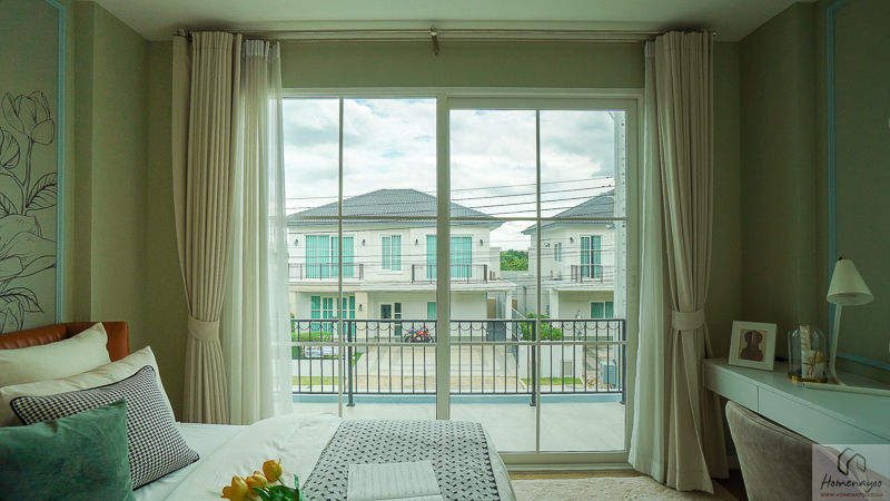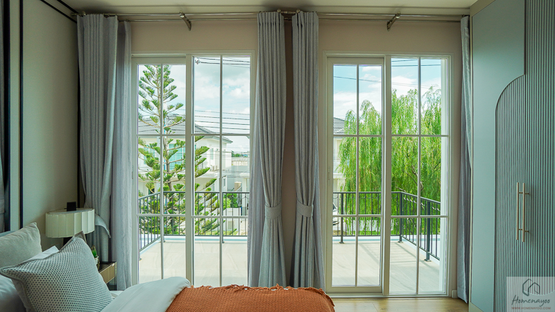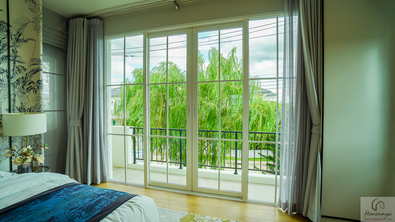 ทางออกไประเบียง ใช้เป็นประตูกระจกบานเลื่อนขนาดใหญ่แบบเปิดกลาง ช่วยให้รับแสงธรรมชาติและลมภายนอกได้เต็มที่ มองออกไปเห็นวิวฝั่งหน้าบ้านที่โปร่งโล่งและสบายตา เพิ่มบรรยากาศการพักผ่อนให้ห้องดูผ่อนคลายมากขึ้น