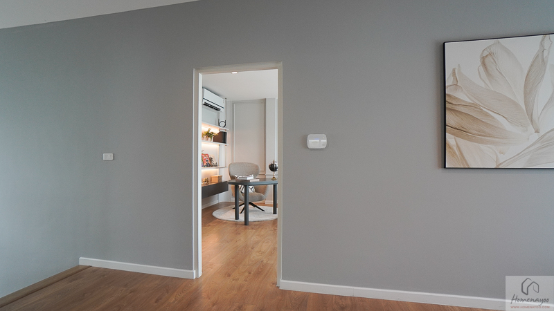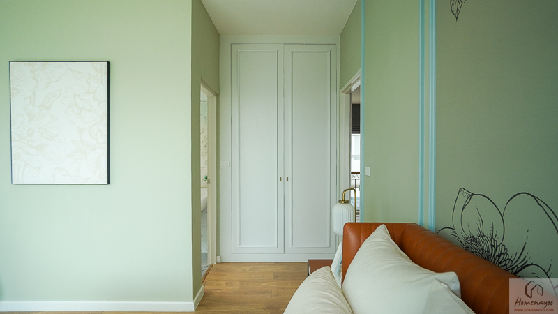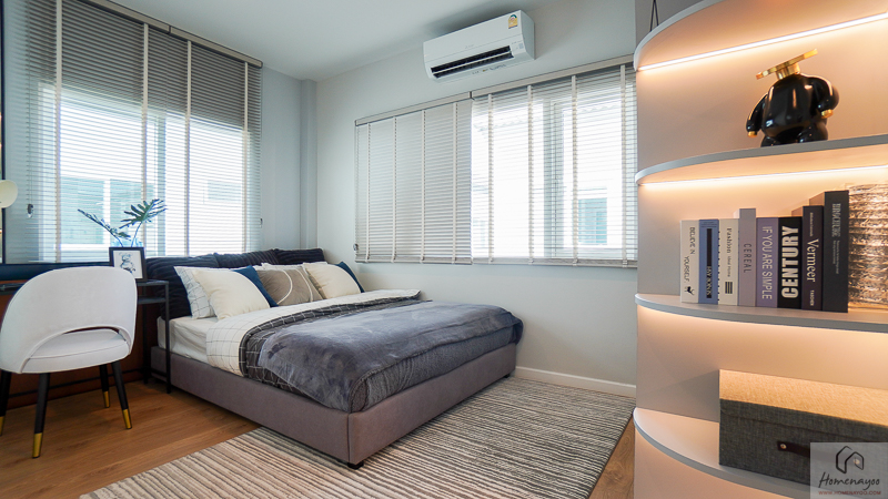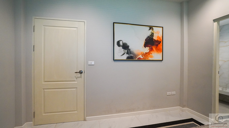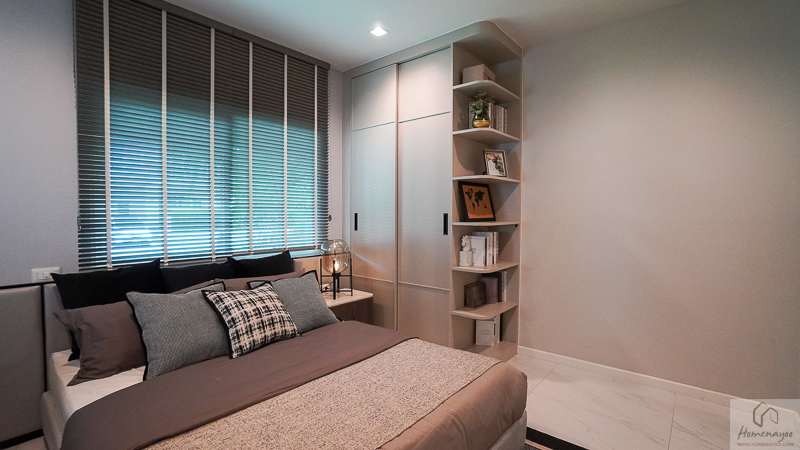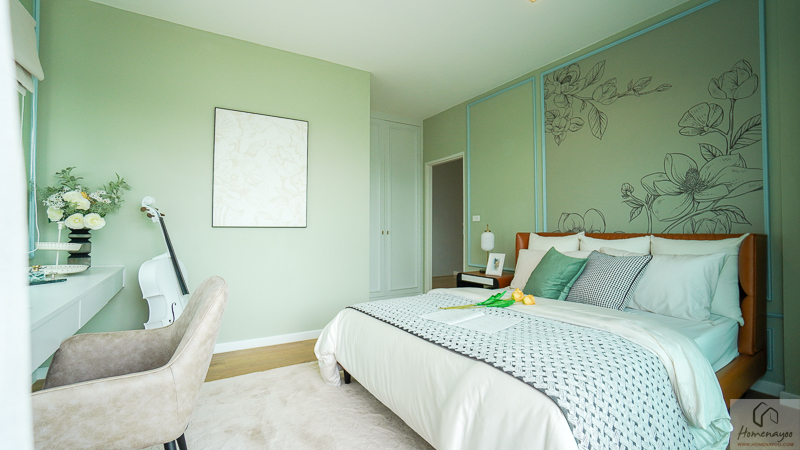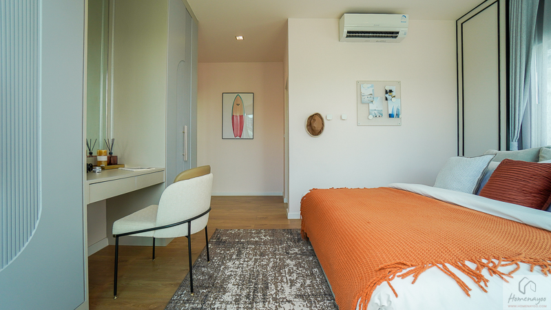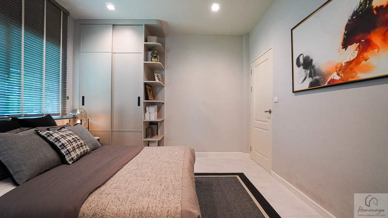 ปลายเตียงนอนเป็นผนังเปล่า มีงานระบบไฟฟ้าติดมาให้เรียบร้อย รองรับการวางชั้นวางทีวี หรือติด Smart TV ที่ผนังได้เลยค่ะ