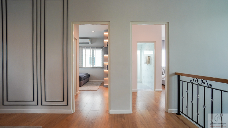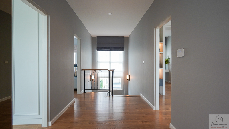 ขึ้นมาที่ชั้น 2 ได้ฝ้าเพดานสูง 2.7 ม. เท่ากันกับชั้นล่าง พื้นบ้านชั้นนี้ปูลามิเนตลายไม้ หนา 12 มม. เดินได้สบายแล้ว และได้บรรยากาศที่ดู Homey มากขึ้น
