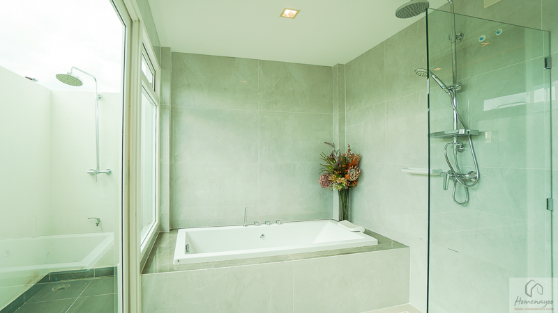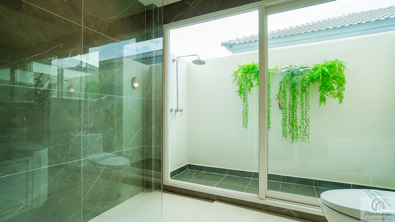 ด้านนอกจะเป็น Outdoor Shower ขนาดใหญ่ กั้นแยกพื้นที่ไว้ด้วยประตูกระจกบานเลื่อน และช่องแสงบานฟิกซ์ด้านหลังอ่างอาบน้ำ