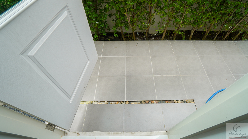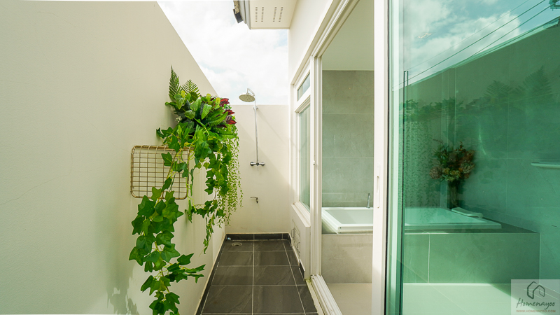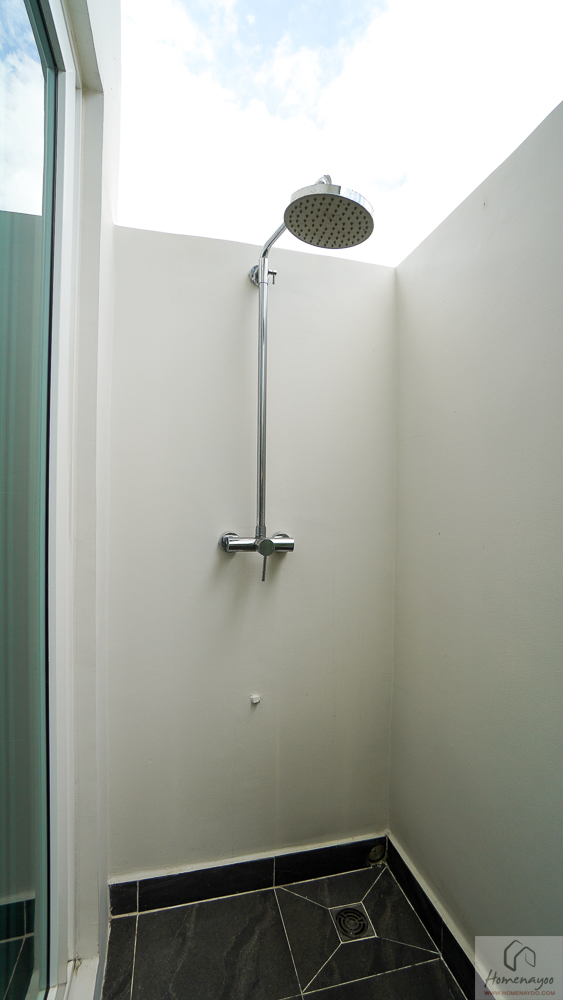พื้นที่ด้านนอกปูพื้นกระเบื้องและก่อกำแพงสูงมาให้เรียบร้อย เพิ่มความเป็นส่วนตัว โดยติดตั้ง Rain Shower ไว้ให้อาบน้ำกลางแจ้งได้อย่างสดชื่น ด้านล่างยังมีก๊อกสนามติดมาให้อีก 1 จุด ใช้ต่อสายยางรดน้ำหรือทำความสะอาดได้สะดวก