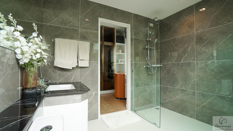 ห้องน้ำ Master กว้างขวาง แบ่งฟังก์ชันส่วนแห้งและส่วนเปียกชัดเจน ปูและกรุผนังด้วยกระเบื้องสีเทาให้ความรู้สึกเรียบหรู สว่าง และสบายตา สุขภัณฑ์ของ American Standard โดยอัปเกรดเป็นรุ่นพรีเมียมทั้งหมด ครบทั้งดีไซน์และฟังก์ชันใช้งาน