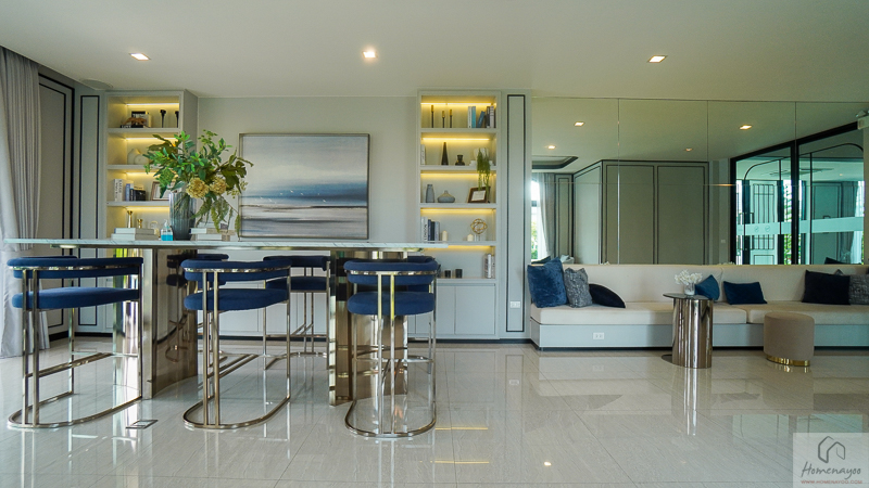 พื้นที่ข้างโต๊ะทานอาหาร หรือบริเวณใกล้ครัว มีพื้นที่เหลือให้ปรับใช้งานได้หลากหลาย จะวางตู้เก็บของ ทำเป็น Pantry อุ่นอาหาร หรือเพิ่มเป็น Coffee Station เล็ก ๆ ก็ดูน่าใช้งาน และด้านหลังจะมีหน้าต่างกระจกบานเลื่อน ให้ใช้เป็นช่องสำหรับส่งอาหารมาเสิร์ฟที่โต๊ะทานข้าวได้ใกล้มากขึ้น