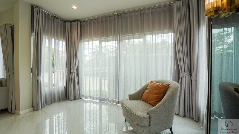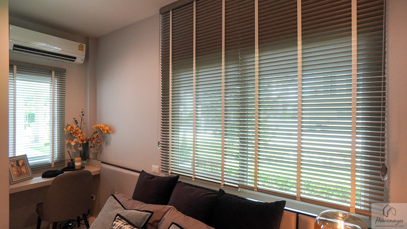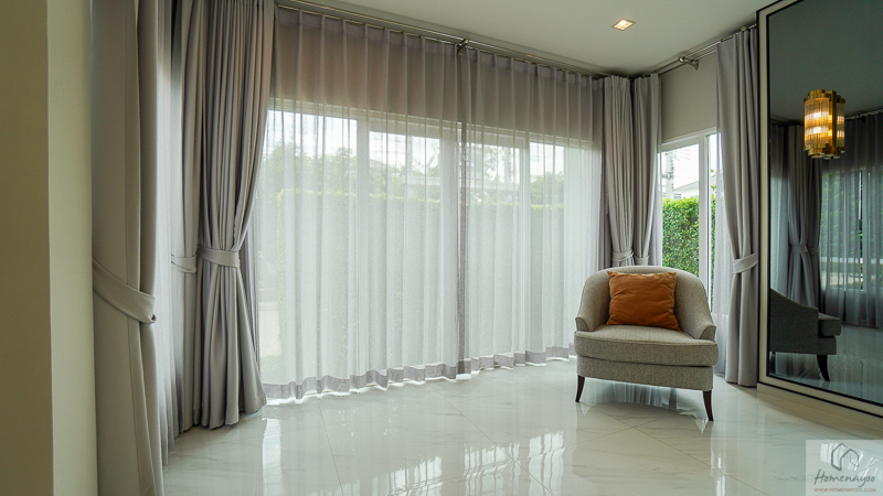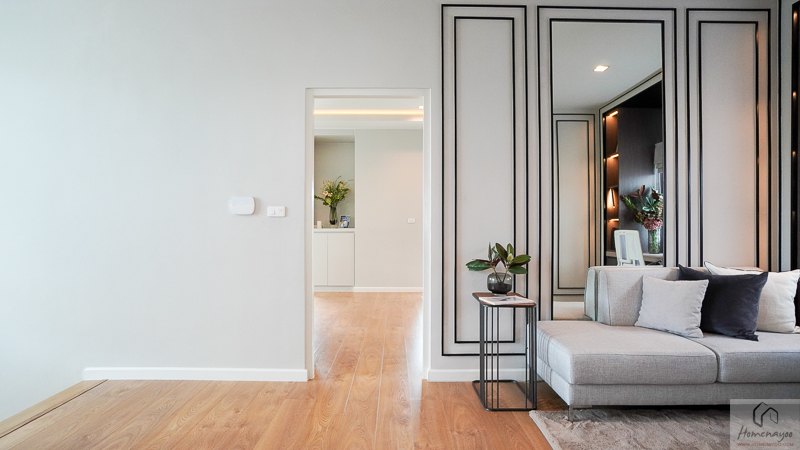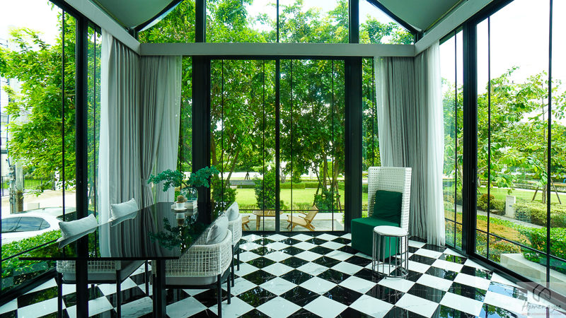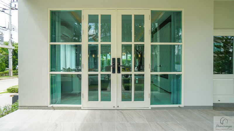 ฝั่งหน้าบ้านจะได้เป็นประตูกระจกบานเลื่อนแบบ Full Height จำนวน 2 ชุด ไว้เปิดเชื่อมกับระเบียงส่วนตัว และยังใช้เป็นช่องแสงธรรมชาติ หรือใช้เปิดรับลม เปิดให้อากาศถ่ายเทได้ด้วย