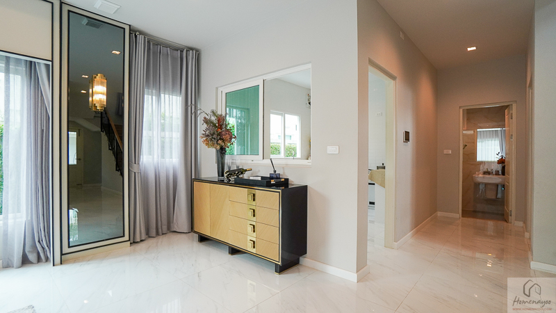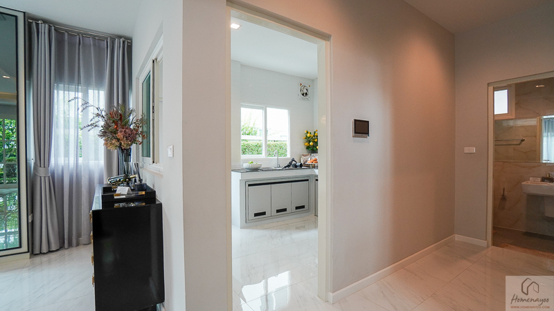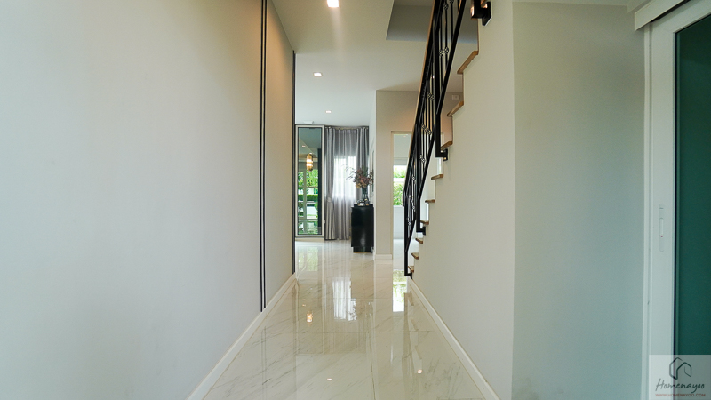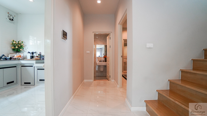 อีกฝั่งของบ้านจะเป็นโถงทางเดินที่ใช้เชื่อมสู่โถงบันได, ห้องครัว, ห้องนอน 4 และห้องน้ำชั้นล่างค่ะ