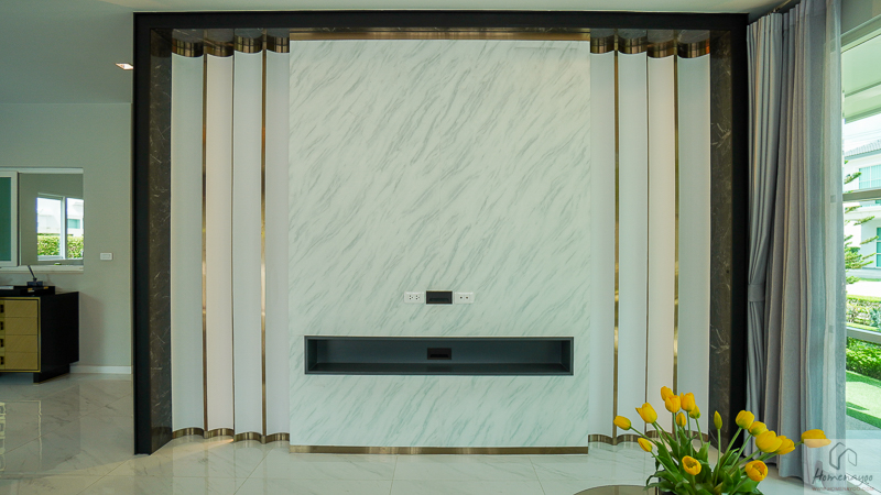 ฝั่งตรงข้ามโซฟา ทางโครงการตกแต่งผนังและชั้นวางของเป็นไอเดียการจัดวาง ส่วนในบ้านจริงจะได้เป็น ผนังเปล่ากว้าง ๆ โดยด้านหลังมีการเดินระบบไฟฟ้า เต้าเสียบปลั๊ก ช่องเสียบสาย Cable TV และ Lan Internet มาให้ครบ รองรับการต่อใช้งานได้ทันทีค่ะ