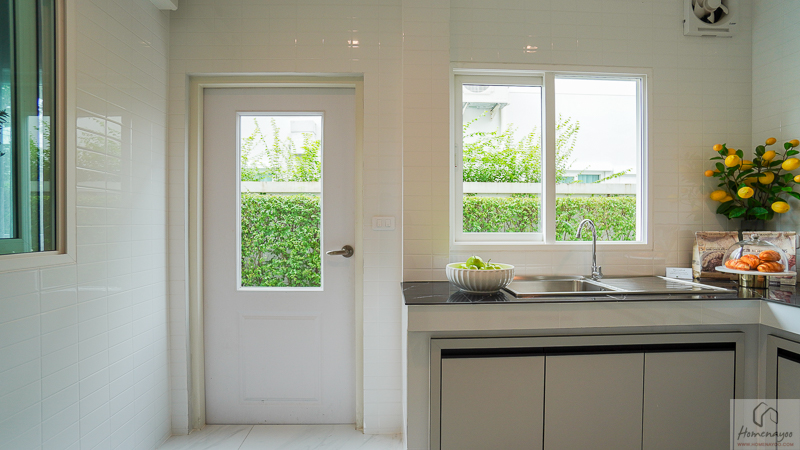 ในห้องครัวจะมีหน้าต่างกระจกบานเลื่อน ใช้เป็นช่องแสงและเปิดระบายอากาศ ระบายกลิ่นควันจากการทำอาหารให้ 1 บาน เสริมด้วยพัดลมดูดอากาศแบบฝังผนังอีก 1 ตัว ซึ่งจะช่วยลดกลิ่นอับ ระบายความชื้นได้ดีทีเดียวค่ะ