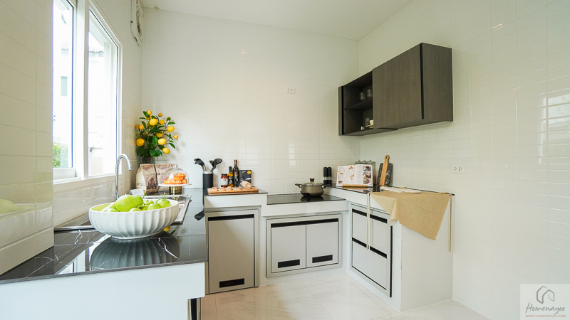 หน้าท็อปครัวจะเป็นกระเบื้องลายหินสีดำ มีการแบ่งพื้นที่สำหรับวางเตาแก๊ส เตรียมอาหาร และติดซิงค์ล้างจานมาให้เรียบร้อย และด้านล่างจะมีหน้าบานตู้เก็บของตามแบบมาตรฐานโครงการติดมาให้ครบ และตรงกลางจะมีพื้นที่ให้ยืนใช้งานได้สะดวกค่ะ