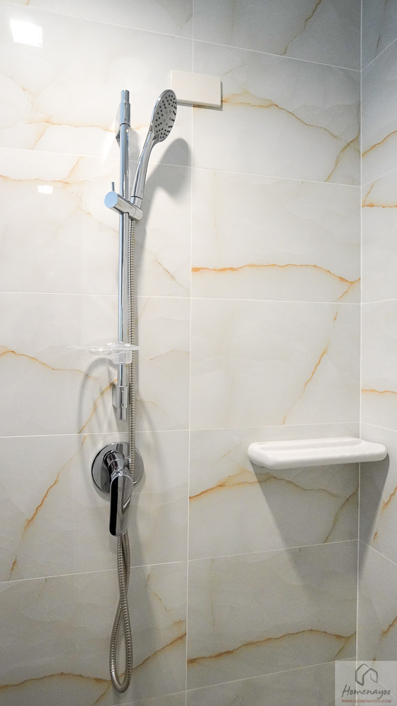 ภายในติดตั้งฝักบัว Hand Shower พร้อมก๊อกน้ำก้านโยกและราวปรับระดับครบชุด ด้านข้างมี Junction Box รองรับการติดตั้งเครื่องทำน้ำอุ่นได้ทันที และมีชั้นวางของเซรามิกติดเข้ามุมมาให้อีก 1 ชิ้นค่ะ