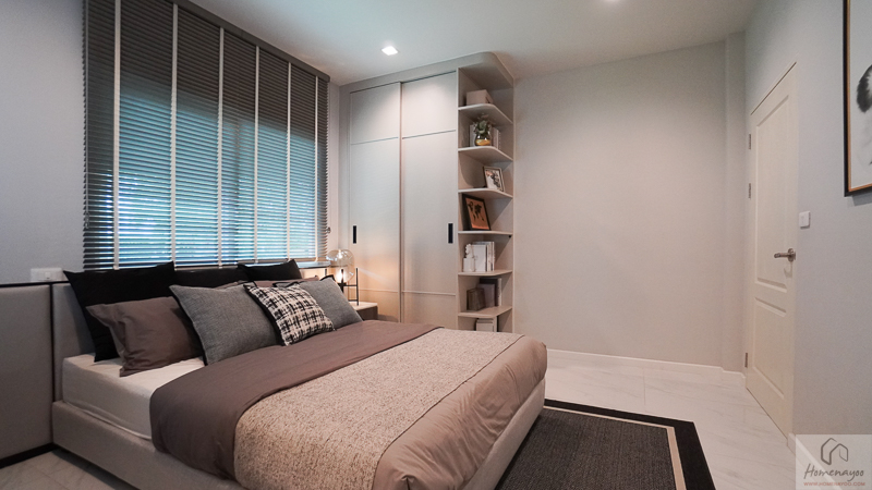 เริ่มจากห้องนอน 2 ทางด้านหน้าบ้าน ภายในห้องจะวาง Layout มาคล้าย ๆ กันกับบ้านหลังแรก คือเข้ามาจะเจอกับห้องน้ำ มุมแต่งตัว เชื่อมกับห้องนอนและระเบียง