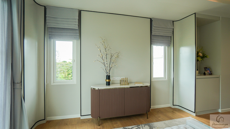 จุดเด่นคือมีหน้าต่างกระจกบานเลื่อนเข้ามุม 2 บาน ที่ช่วยดึงแสงธรรมชาติและเพิ่มการระบายอากาศ ทำให้ห้องนี้ดู โปร่ง สว่าง และอยู่สบายมากยิ่งขึ้น