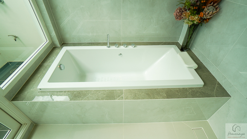 อ่างอาบน้ำแบบฝังเคาน์เตอร์ มาพร้อมฝักบัว ก๊อกอ่าง และระบบน้ำร้อน-น้ำเย็น ใช้งานสะดวก รอบ ๆ อ่างยังมี Low-Wall สำหรับวางของใช้หรือของตกแต่งได้อีกเพียบ ช่วยเพิ่มความสวยงามและความเป็นระเบียบในห้องน้ำได้อย่างดีค่ะ