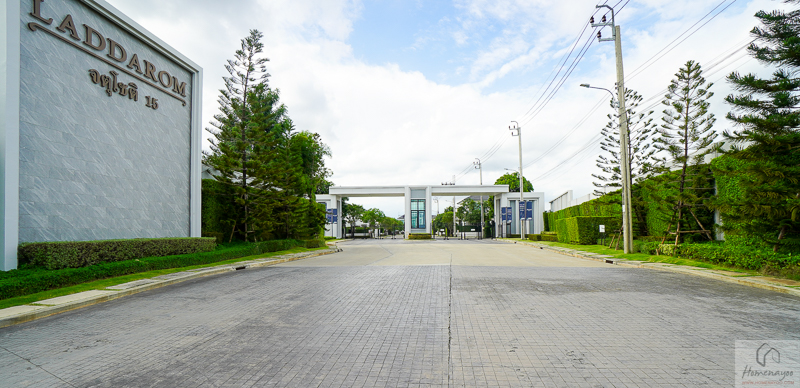 ด้านหน้าโครงการ ลัดดารมย์ จตุโชติ 15 ออกแบบมาให้ดูหรูหราและโอ่อ่าตั้งแต่ทางเข้า เริ่มจากป้ายชื่อโครงการขนาดใหญ่ ริมถนนเมนที่กว้างขวาง สองข้างทางจัดแต่งด้วยสวนสวยร่มรื่น และมีระยะ Setback ก่อนถึง Main Gate ทำให้มีพื้นที่ชะลอรถเข้า-ออกได้สะดวกและปลอดภัย