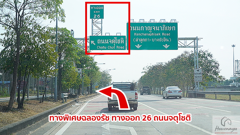 เราใช้ทางด่วนฉลองรัช ที่มาจากพระราม 9-เอกมัย มุ่งหน้าไปถนนกาญจนาภิเษกฯ เบี่ยงซ้ายออกทางพิเศษฉลองรัช ทางออก 26 เข้าสู่ถนนจตุโชติ