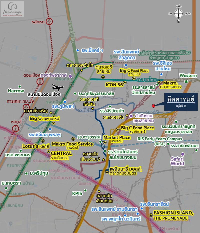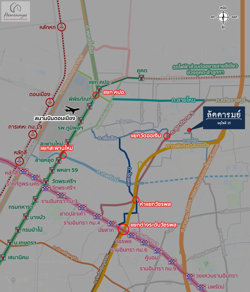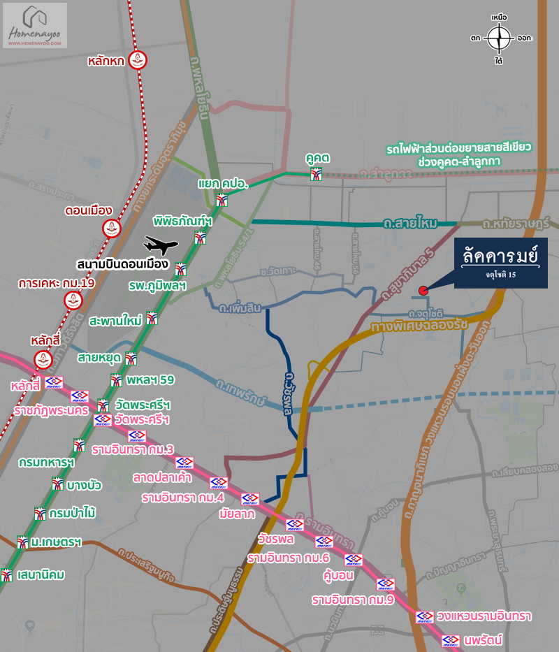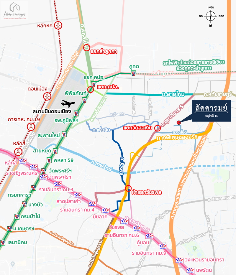 ⇒ การเดินทางโดยรถไฟฟ้า : แม้โครงการจะเน้นการเดินทางด้วยรถส่วนตัวเป็นหลัก แต่ก็ยังใกล้รถไฟฟ้าถึง 2 สายที่เปิดใช้งานแล้ว ได้แก่ สายสีชมพู (สถานีวัชรพล, สถานีวงแหวนรามอินทรา) และ สายสีเขียวเหนือ (สถานีสะพานใหม่) ที่สามารถนั่งต่อเดียวเข้าสู่ลาดพร้าว จตุจักร สยาม หรือสุขุมวิทได้ง่าย ใครที่อยากใช้รถไฟฟ้าก็ยังสะดวก ไม่ต้องขับรถออกไปไกลค่ะ