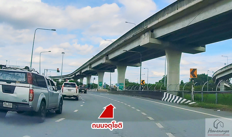 หากออกจากโครงการแล้วเลี้ยวซ้าย ผ่านซอยจตุโชติ 17 ถนนจะเปลี่ยนเป็น One Way ซึ่งเส้นนี้สามารถเชื่อมต่อไปยังถนนเลียบวงแหวนฯ และออกทางด่วนกาญจนาภิเษกได้โดยตรง อีกทั้งยังใกล้ด่านทางด่วนฉลองรัช (ด่านจตุโชติ) ฝั่งขาเข้าเมืองเพียง 2.3 กม.* เรียกได้ว่าขึ้นทางด่วนได้ใกล้และรวดเร็ว