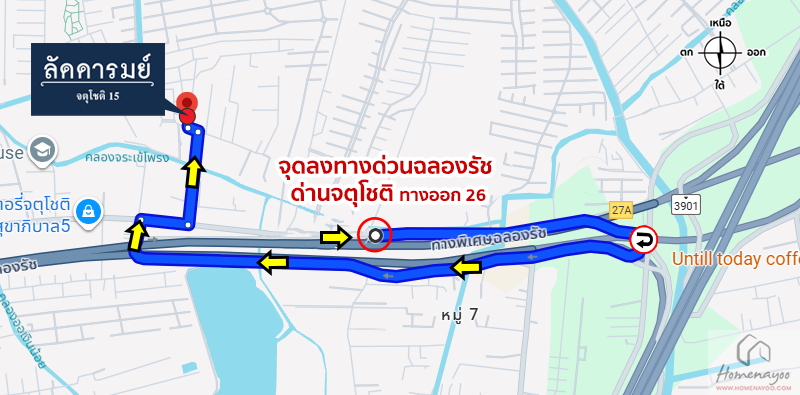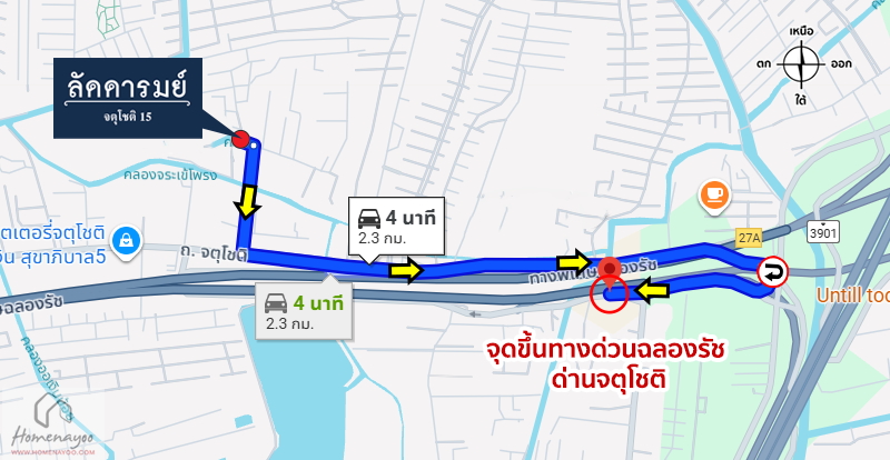 การเดินทางเริ่มจากจุดลงทางด่วนฉลองรัช ด่านจตุโชติ ⇒ ถนนจตุโชติ (One Way) กลับรถใต้ทางด่วน ⇒ ถนนจตุโชติ (เลียบทางด่วน) ⇒ ลอดใต้ทางด่วนอีกครั้ง ⇒ ซอยจตุโชติ 15 ⇒ 350 ม.* ถึงโครงการ ลัดดารมย์ จตุโชติ 15