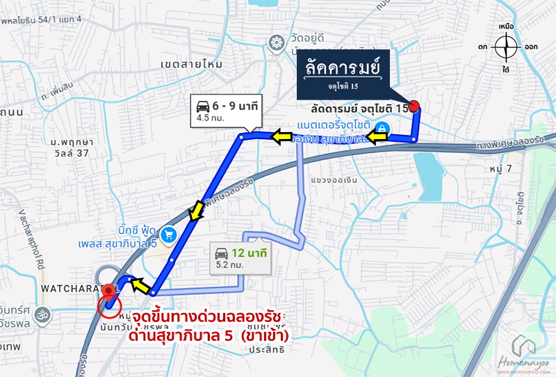 อีกหนึ่งทางเลือกคือ ด่านสุขาภิบาล 5 (ขาเข้าเมือง) ซึ่งอยู่ห่างจากโครงการประมาณ 4.5 กม.* ใช้เวลาขับรถราว 5-10 นาที* โดยสามารถมุ่งหน้าเข้าสู่เส้นทางเดียวกันกับด่านจตุโชติ เรียกได้ว่าสะดวกทั้งสองฝั่ง ใครถนัดใช้งานด่านไหนก็เลือกได้ตามความสะดวกเลยค่ะ