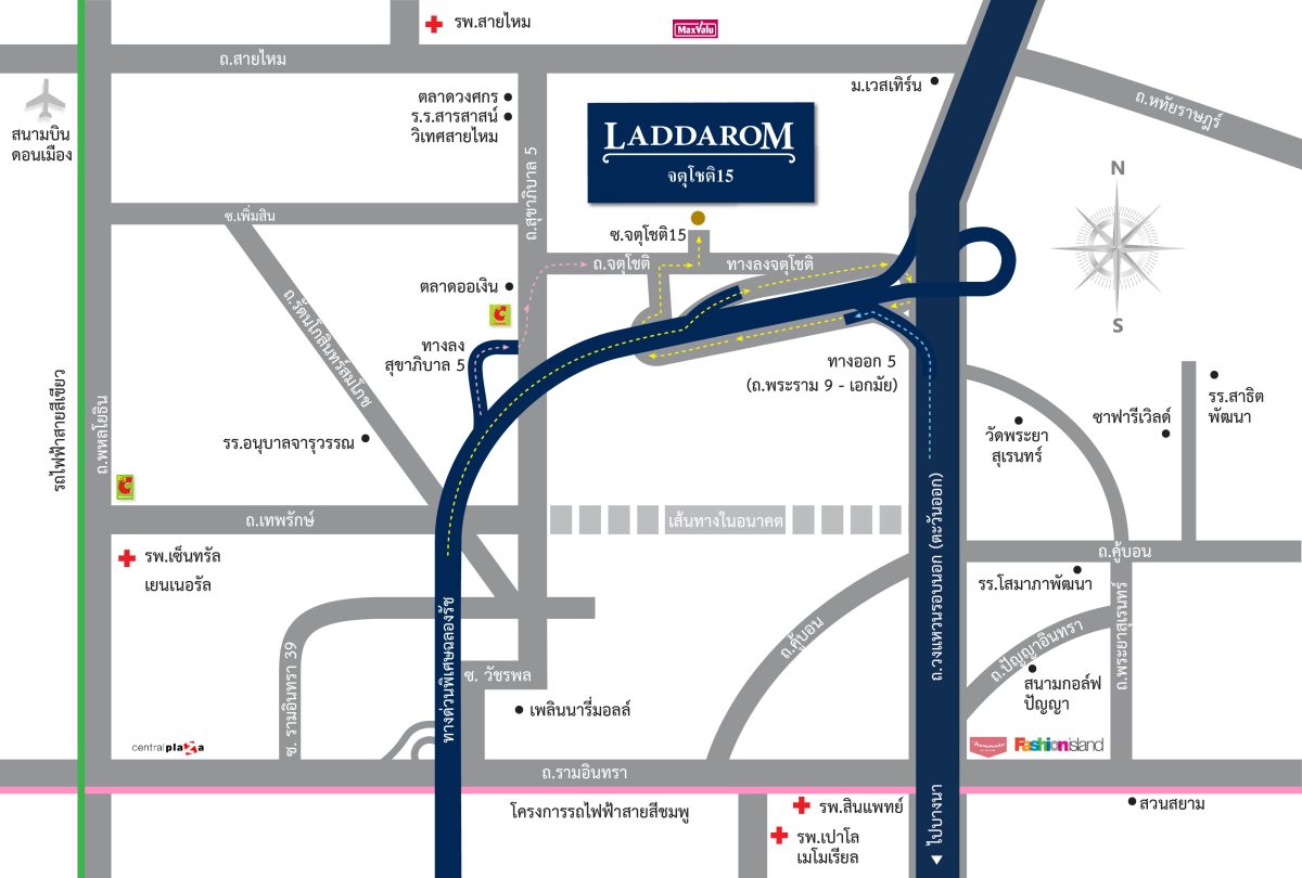 การเดินทางโดยรถส่วนตัว : จากโครงการ ลัดดารมย์ จตุโชติ 15 ถือว่าสะดวกมาก ๆ เพราะตั้งอยู่ในซอยจตุโชติ 15 เพียง 350 ม.* จากถนนจตุโชติ โดยถนนเส้นหน้าโครงการจะอยู่ช่วงต้นถนนจตุโชติ ตั้งแต่แยกสุขาภิบาล 5 มาจนถึงก่อนซอยจตุโชติ 17 ซึ่งยังเป็นถนน 2 เลน วิ่งสวนกันได้สบาย