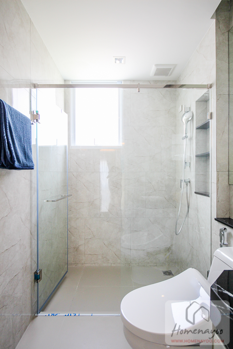 และส่วนอาบน้ำ พร้อมสุขภัณฑ์ และฉากกั้นห้องน้ำมาให้ได้ตามที่เห็นเลยค่ะ จัดว่าสเป็คมาดีงาม มีสุขภัณฑ์แบบ Washlet กระเบื้องพื้นขนาด 60×60 cm. ลายหินอ่อนสีขาวขีดเทาผิวด้าน ผนังเป็นกระเบื้องแบบเดียวกันปูจรดเพดานดูสวยสบายตาดี โดยพื้นห้องน้ำลดระดับลงต่ำกว่าส่วนห้องนั่งเล่นประมาณ 5 เซนติเมตร มี Low Wall ด้านหลังอ่างล้างมือและโถสุขภัณฑ์ ทำให้ได้พื้นที่วางของเพิ่มเยอะดี