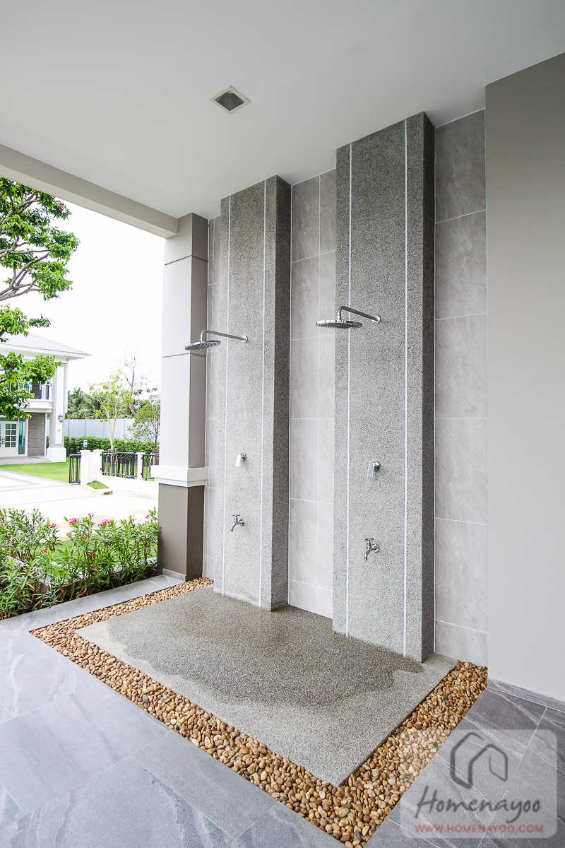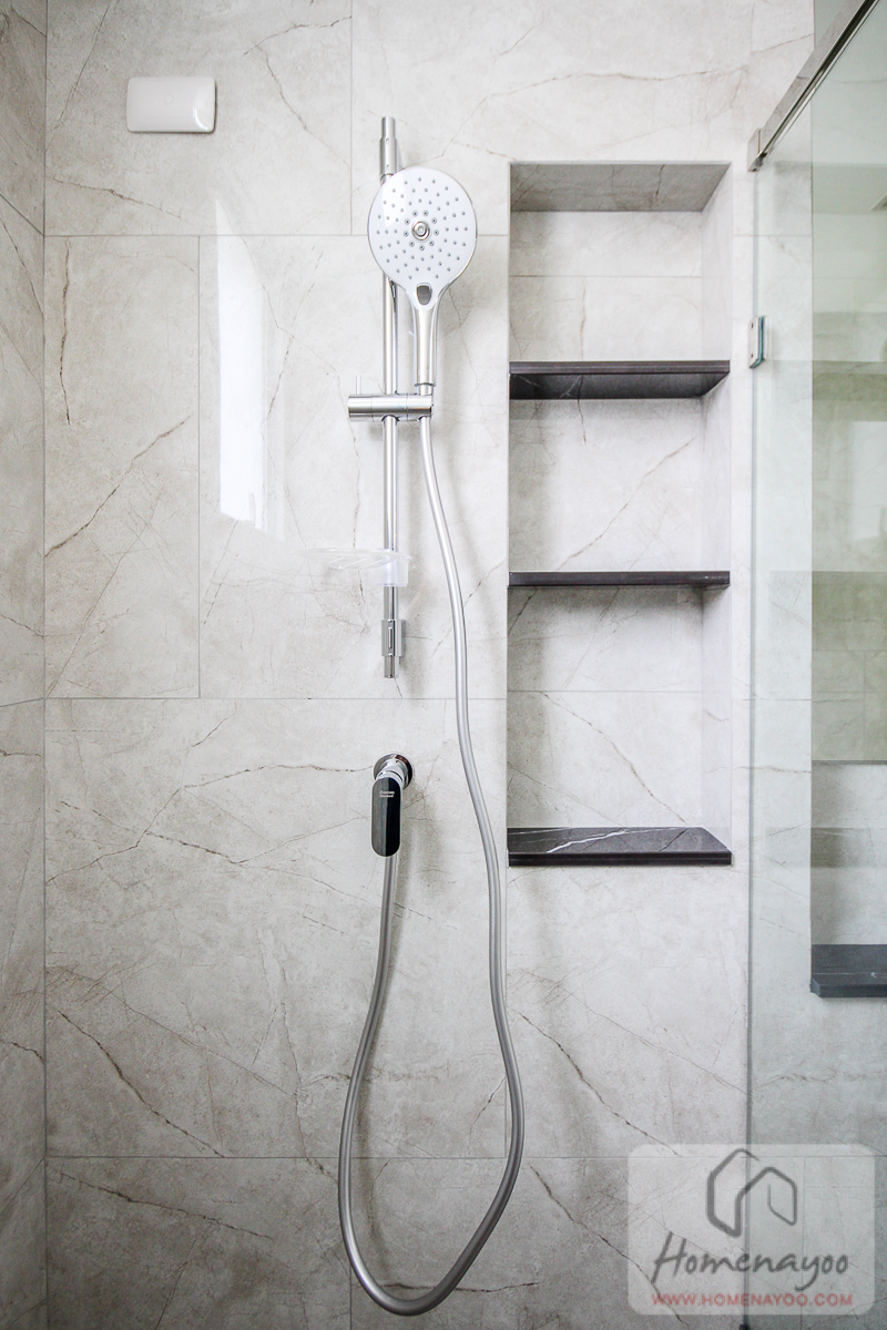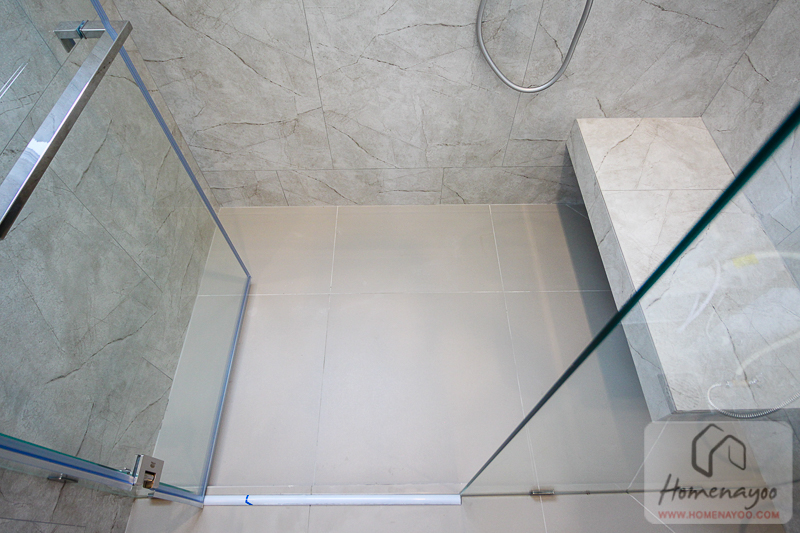 ที่มุมอาบน้ำลดระดับพื้นส่วนเปียกลงไปประมาณ 5 cm. และมีหน้าต่างบานกระทุ้งไว้ให้เปิดระบายอากาศและพัดลมดูดอากาศ ที่ผนังฝั่งชุดฝักบัวติดตั้งงานระบบสำหรับเครื่องทำน้ำร้อนมาให้เรียบร้อย ที่ผนังเจาะที่วางของมาให้ถึง 3 ชั้น
