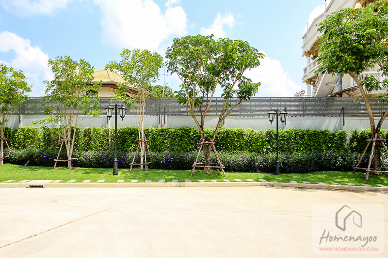 จากหน้าซุ้มโครงการมองไปทางทิศใต้จะเป็นรั้วพุ่มไม้ตกแต่งเป็นระเบียงเรียบร้อย และมีป้ายโฆษณาโครงการติดอยู่