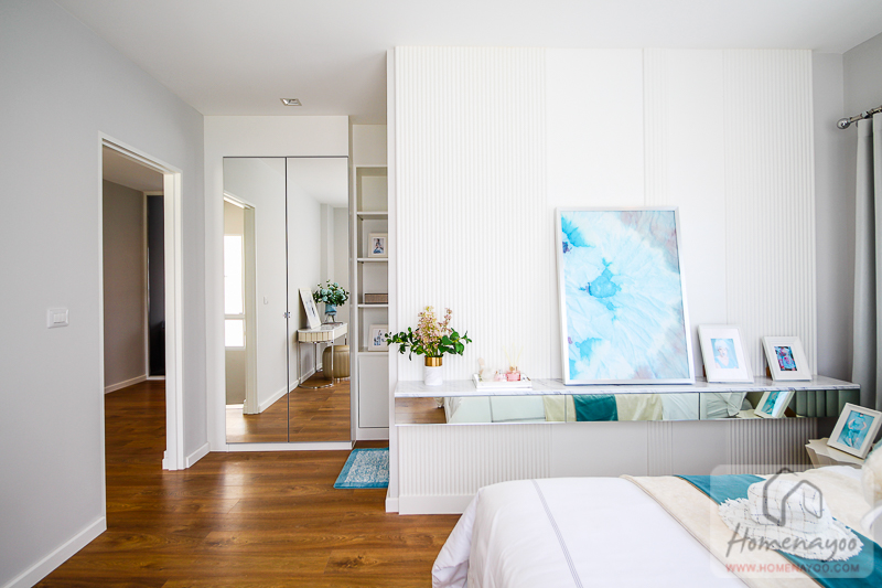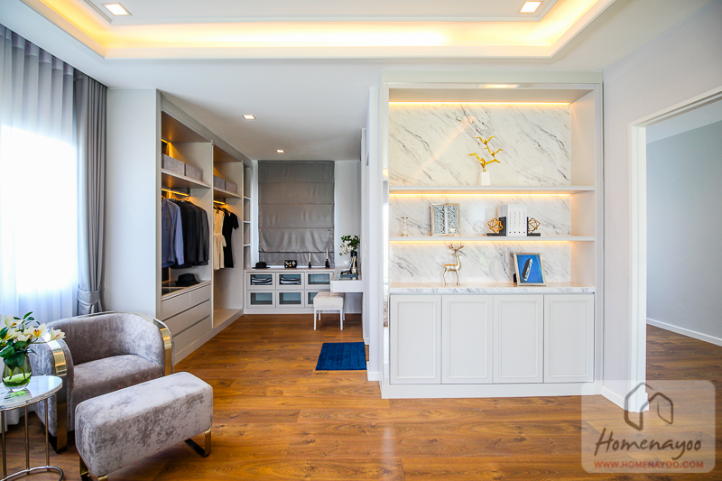 ส่วน Walk in closet บ้านตัวอย่างทำ Built in ตู้เสื้อผ้าและโต๊ะเครื่องแป้งมาให้ดูระยะใช้งานกำลังพอดีๆ