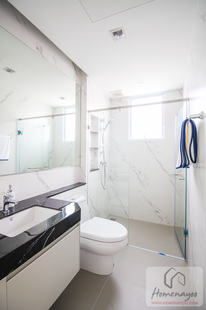 ส่วนห้องน้ำ จะมีส่วนอาบน้ำ พร้อมสุขภัณฑ์ และฉากกั้นห้องน้ำมาให้ได้ตามที่เห็นเลยค่ะ จัดว่าสเป็คมาดีงาม กระเบื้องพื้นขนาด 60×60 cm. ผนังเป็นกระเบื้องลายหินอ่อนปูจรดเพดานดูสวยสบายตาดี โดยพื้นห้องน้ำลดระดับลงต่ำกว่าส่วนห้องนอนประมาณ 5 เซนติเมตร เพดานติดไฟดาวน์ไลท์ พร้อมมีหน้าต่างบานกระทุ้งให้เปิดระบายอากาศได้