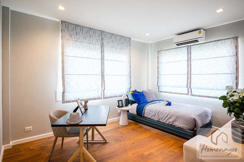 บ้านตัวอย่างวางเตียงเดี่ยวพร้อมชั้นทีวีปลายเตียงและโต๊ะข้างมาให้ดูระยะใช้งานสบายๆ