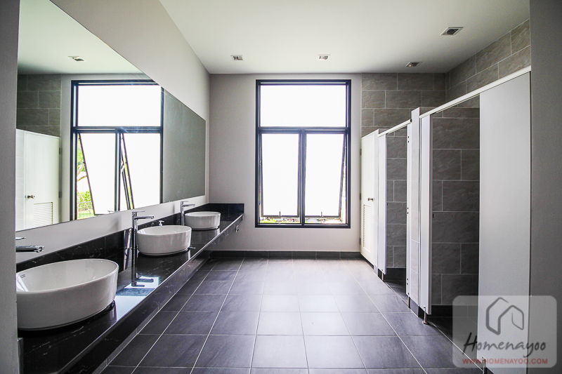 ในห้องน้ำจะมีส่วนอาบน้ำ พร้อมสุขภัณฑ์ กระเบื้องพื้นขนาด 60×60 cm. ผนังเป็นกระเบื้องลายหินอ่อนปูจรดเพดานดูสวยสบายตาดี โดยพื้นห้องน้ำลดระดับลงต่ำกว่าส่วนห้องนอนประมาณ 5 เซนติเมตร เพดานติดไฟดาวน์ไลท์ พร้อมมีหน้าต่างบานกระทุ้งให้เปิดระบายอากาศได้