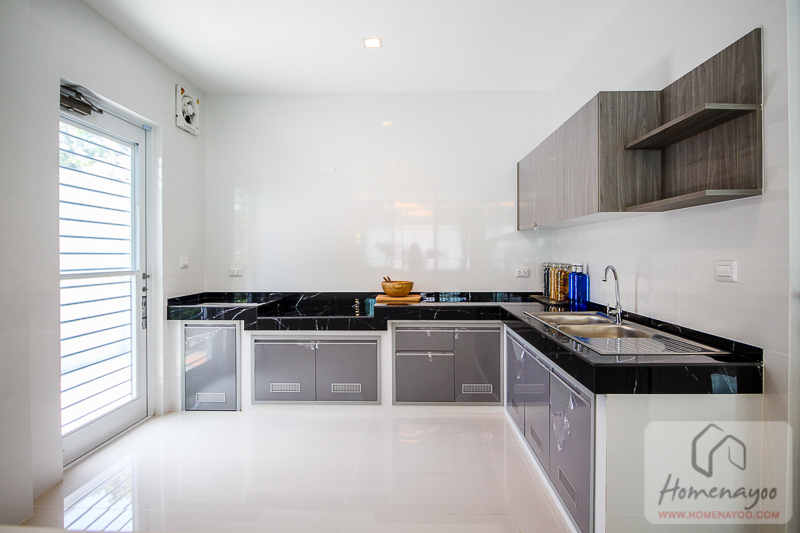 ภายในห้องครัวปิดจะเห็นว่าทำ built in ชุดเคาน์เตอร์ครัวรูปตัว L พร้อมชั้นลอยมาให้เรียบร้อย และมีขนาดกว้างขวาง พร้อมพื้นที่เก็บของที่เยอะ