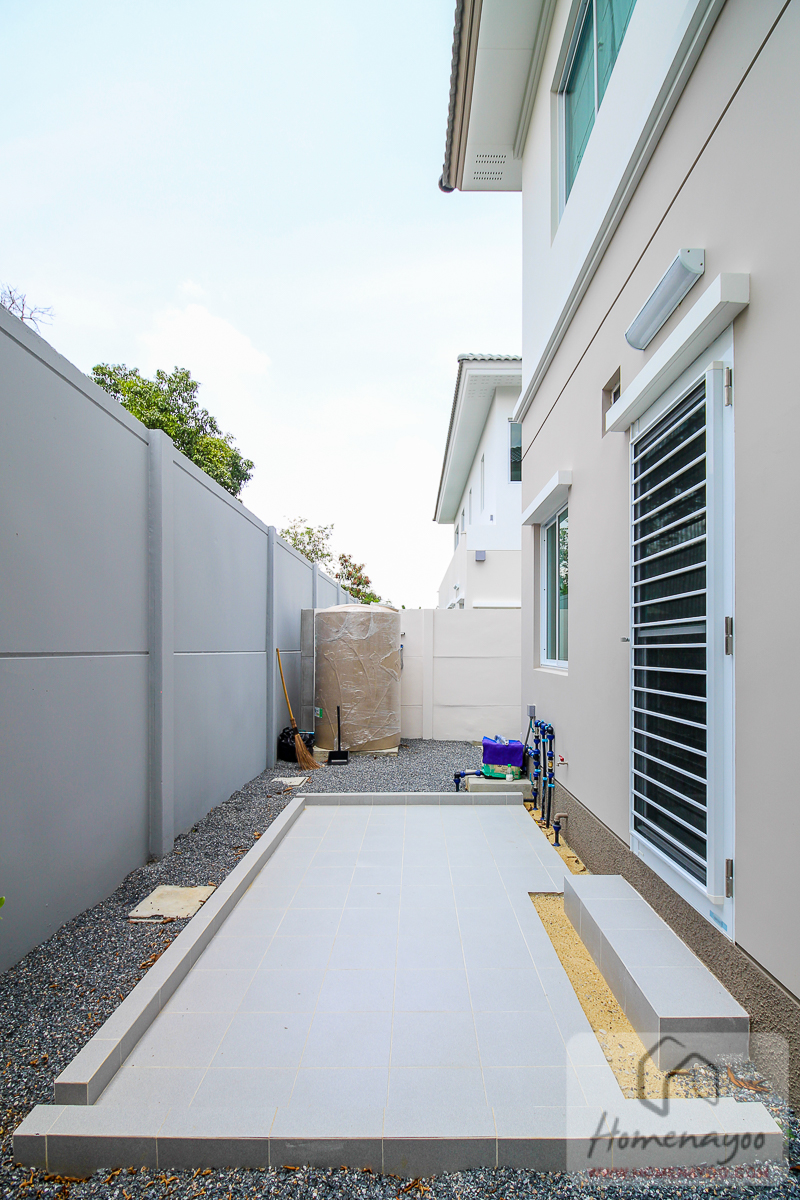 ลานหลังบ้านจะเชื่อมต่อกับประตูครัวค่ะ ส่วนลานหลังบ้านปูกระเบื้องเซรามิกมาให้แยกโครงสร้างกับตัวบ้าน พร้อมมีก๊อกน้ำและไฟผนังสำหรับตอนกลางคืนติดตั้งมาให้เรียบร้อย